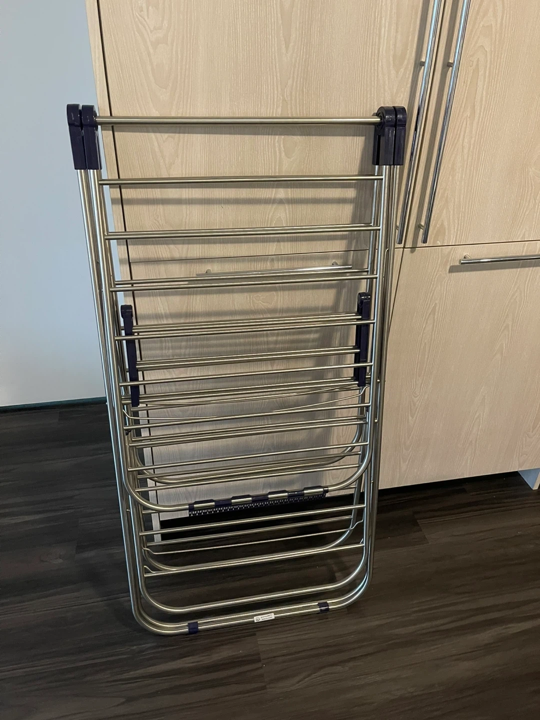 This is a collapsible metal drying rack with multiple tiers for hanging clothes. It's easy to set up and fold away for storage.