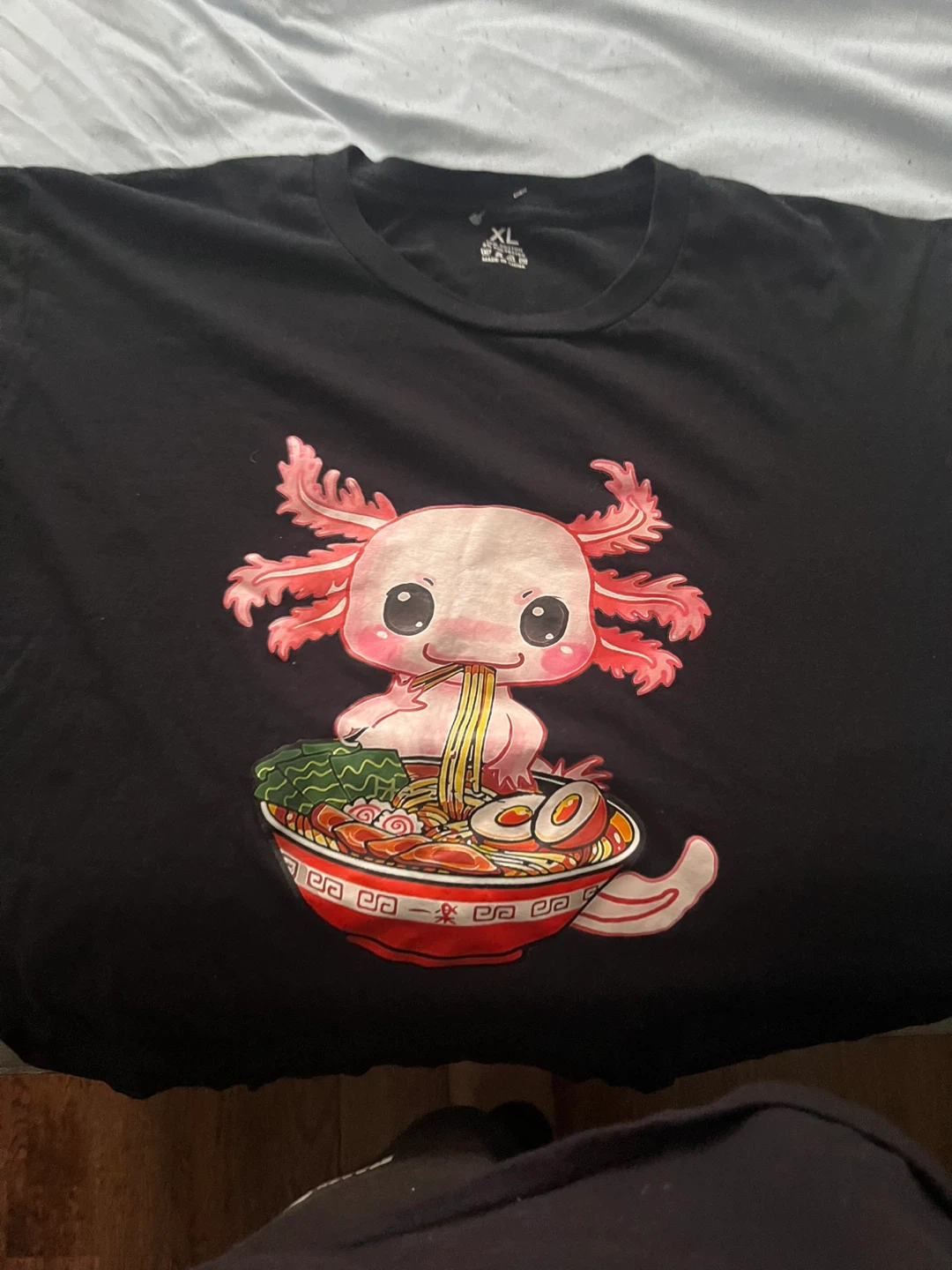44Cute black t-shirt featuring an axolotl eating ramen! The size is XL and the material is 94% cotton and 6% polyester