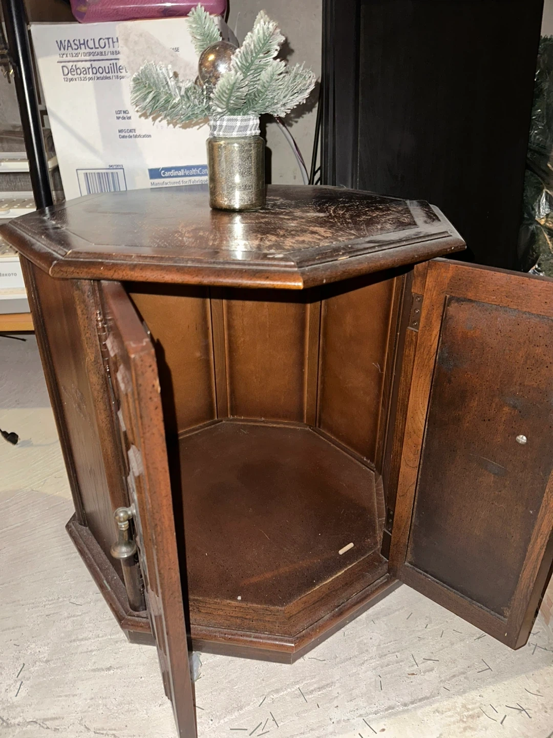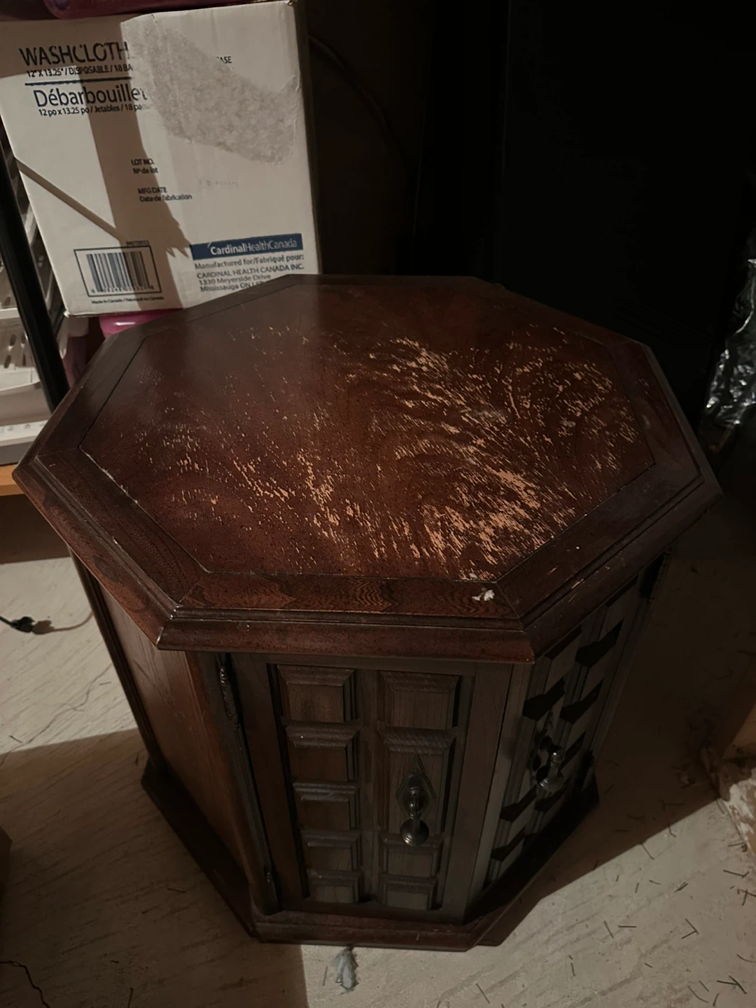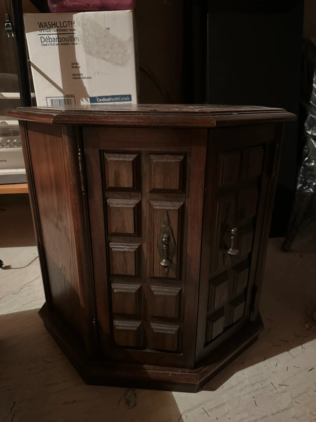 Buy & SellVintage Hexagonal Side Table with DoorsVintage Hexagonal Side Table with Doors$24Wooden hexagonal side table with two doors and brass handles. It has storage space inside. Wood material with some wear on the top surface.ConditionOkayWHERE TO MEETCheck LocationView MapSELLERverifiedYefaAlton N600 reviews0 chats·2 favorites·48 viewsSEND CHAT TO SELLERHi Yefa! I’m interested in your listing.Hi Yefa! I’m interested in your listing.Get the Karrot app to chatSign In to chat