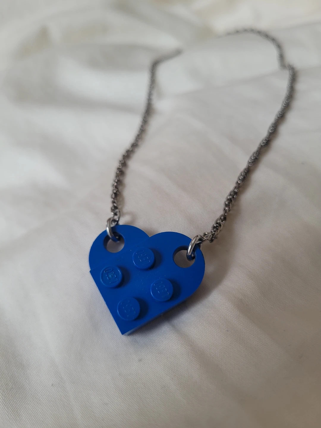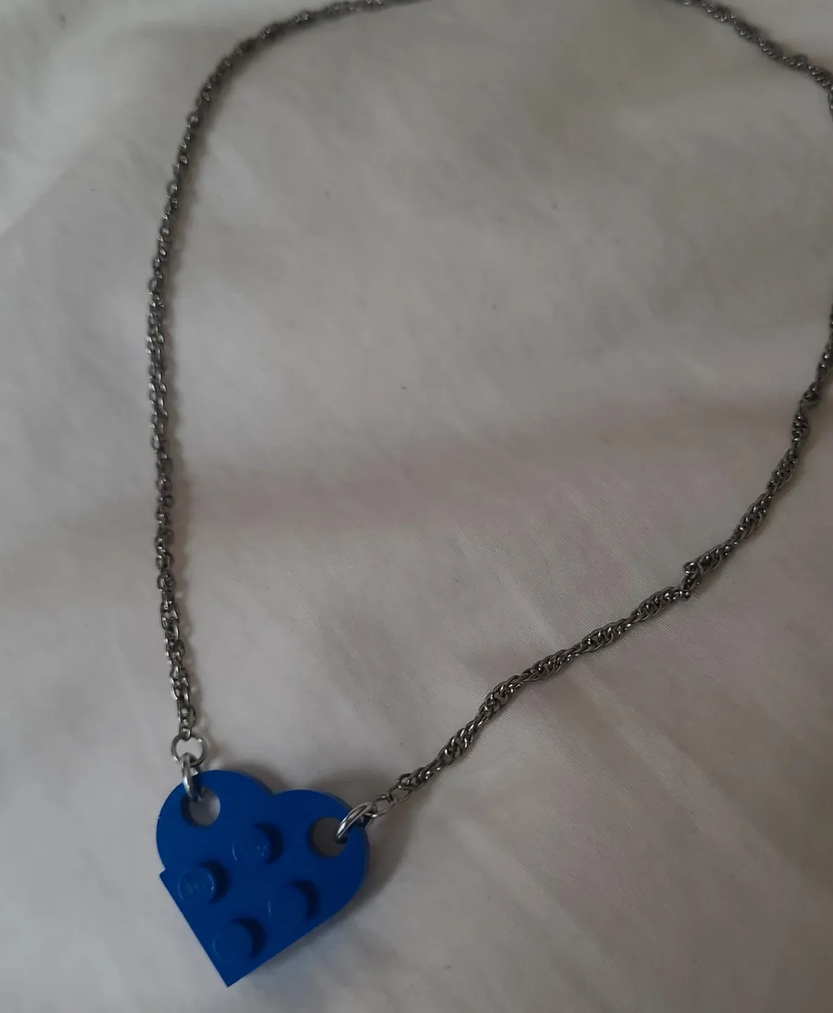 Fun for all ages!! Perfect condition to sell, yet giving for FREE to the community! 🧡 This is a unique necklace featuring a blue heart-shaped charm made from a Lego brick. It's attached to a silver-toned chain. The charm has the classic Lego stud pattern.