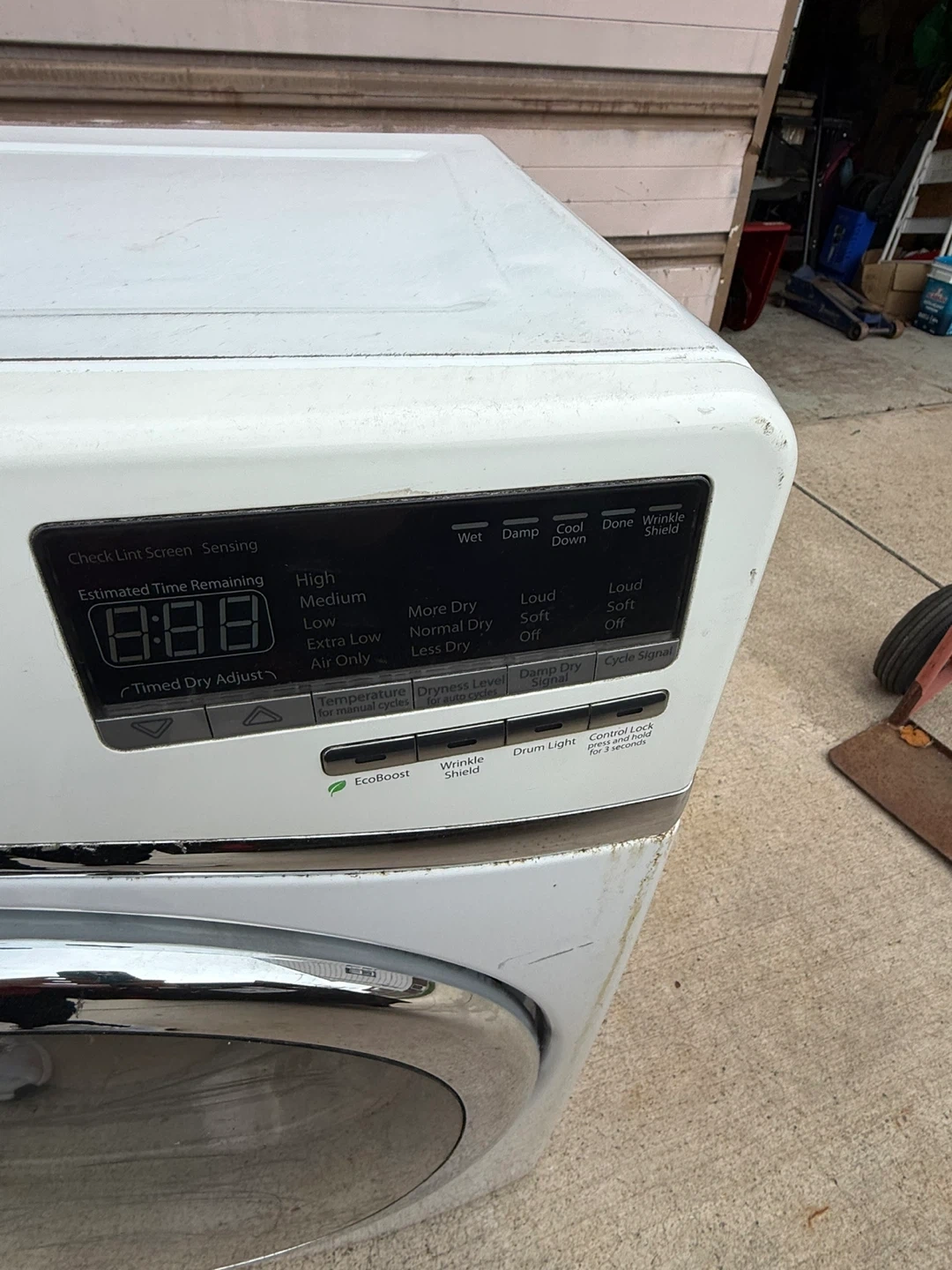 Whirlpool Duet electric dryer in white. Features EcoBoost and Wrinkle Shield settings. Includes a lint screen and internal drum. This dryer is a great addition to any laundry room!
