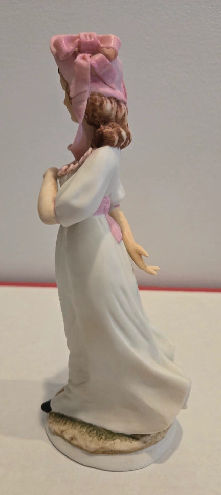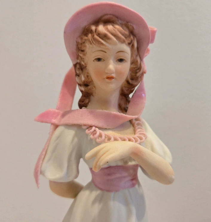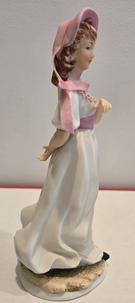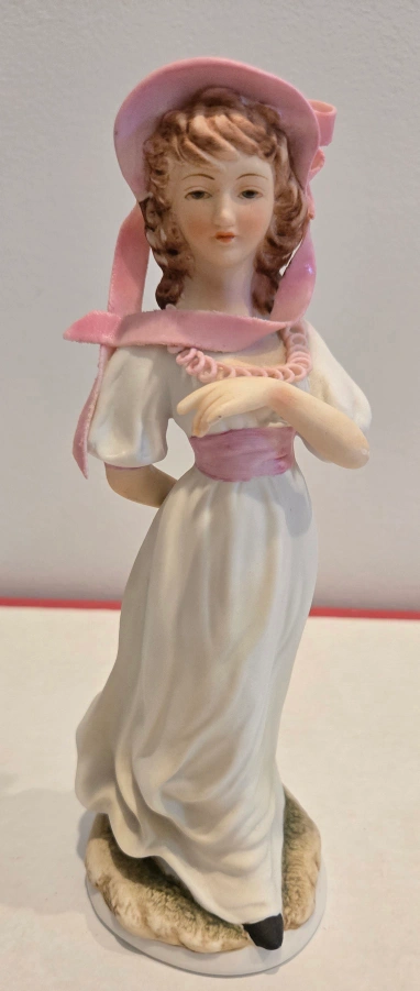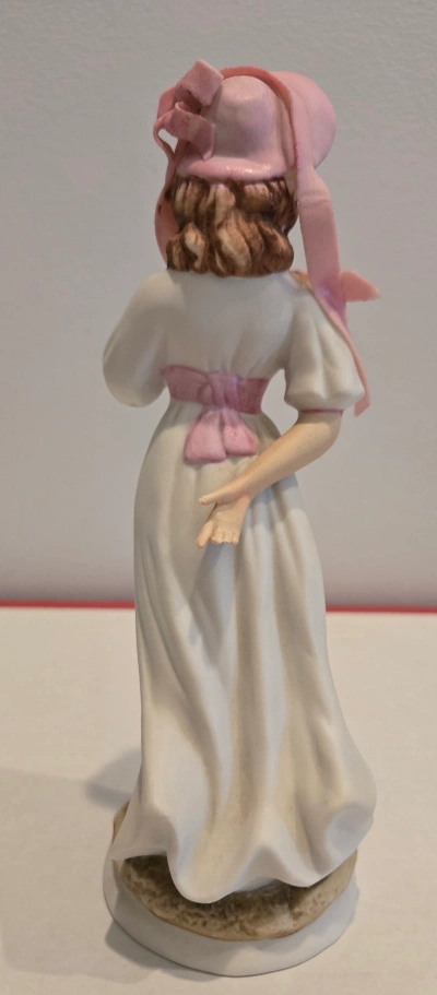 Beautiful porcelain figurine. Young woman in a white dress and pink bonnet. Pink ribbon accents. Collectible.