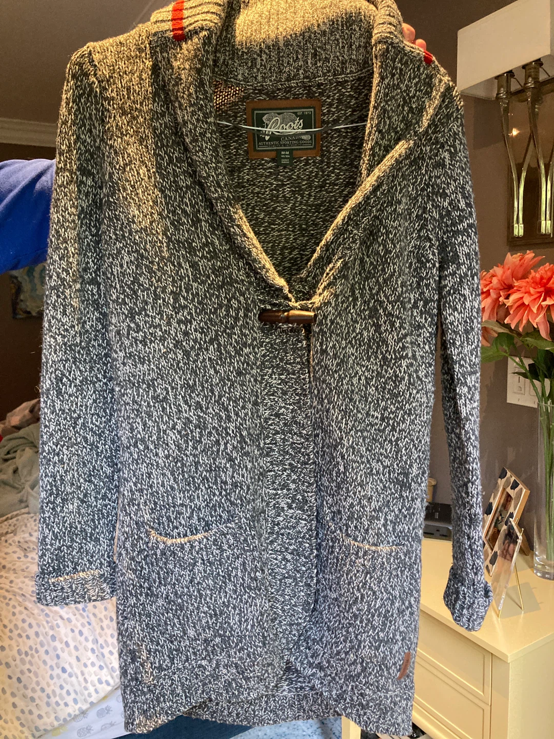 Long women’s sweater with single button and two front pockets. Size medium. This is part of the Roots Cabin collection. In great shape, only worn a couple times.
