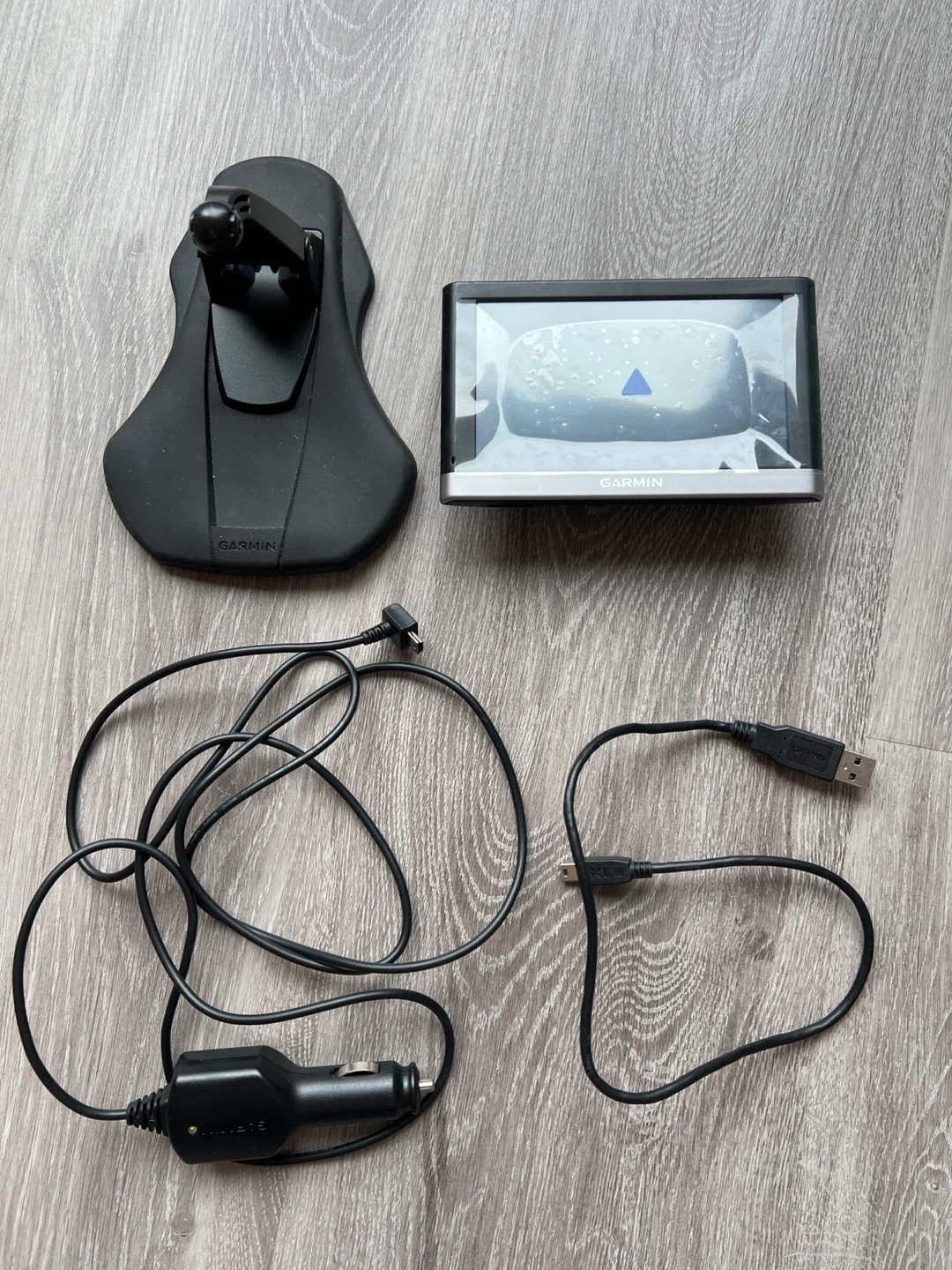 Garmin GPS unit with car mount and charging cables. Includes a cigarette lighter adapter and a USB cable. Power on this device for navigation needs.