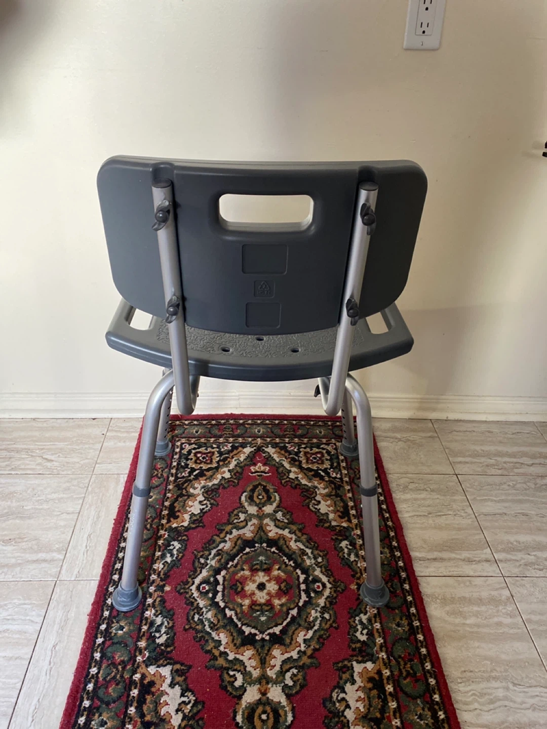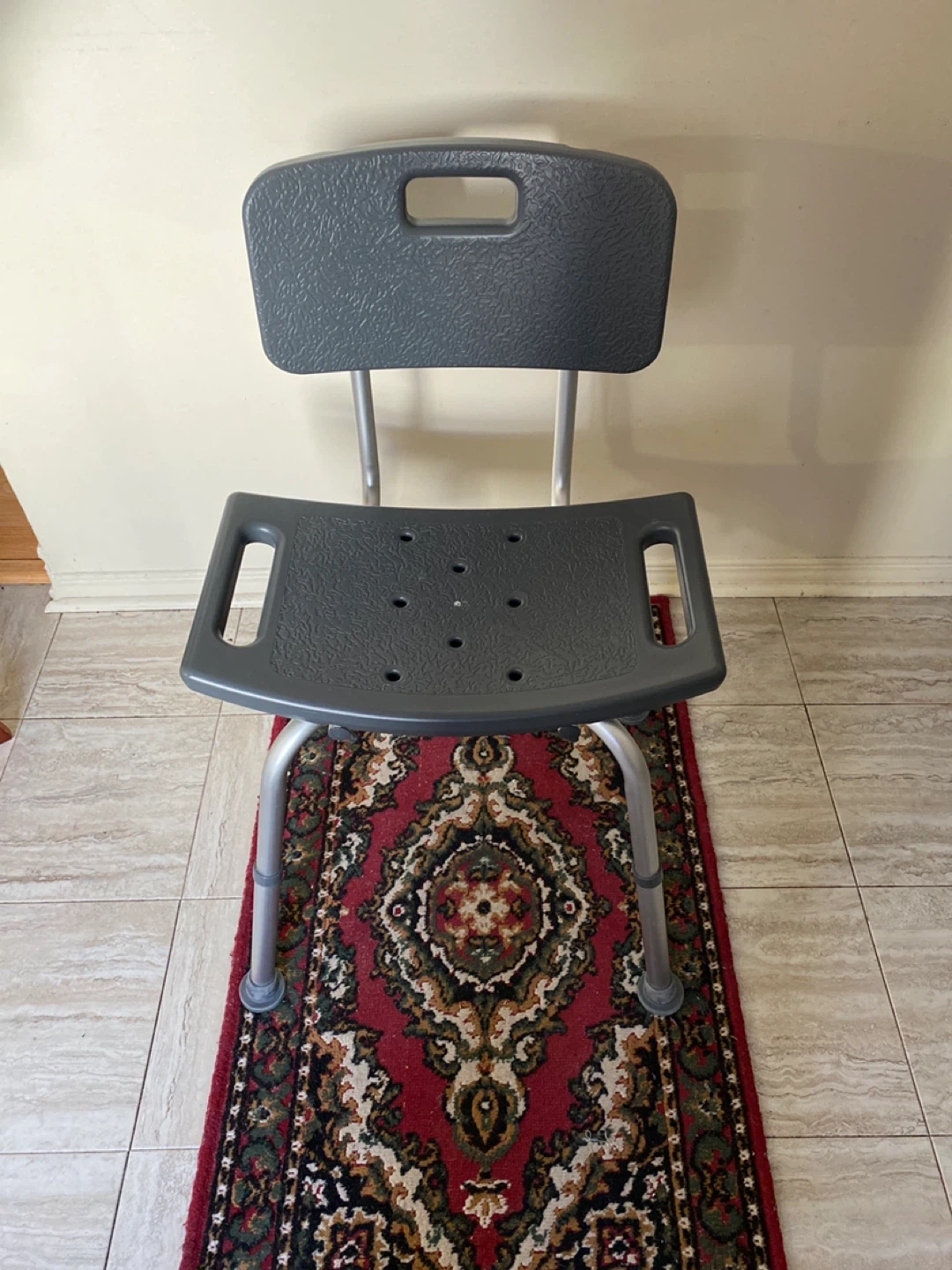 This is a shower chair with a backrest. It's made of durable plastic and aluminum. The legs are adjustable for height. It's designed for safety and stability in the shower. Has been sat on but never in the shower! As New