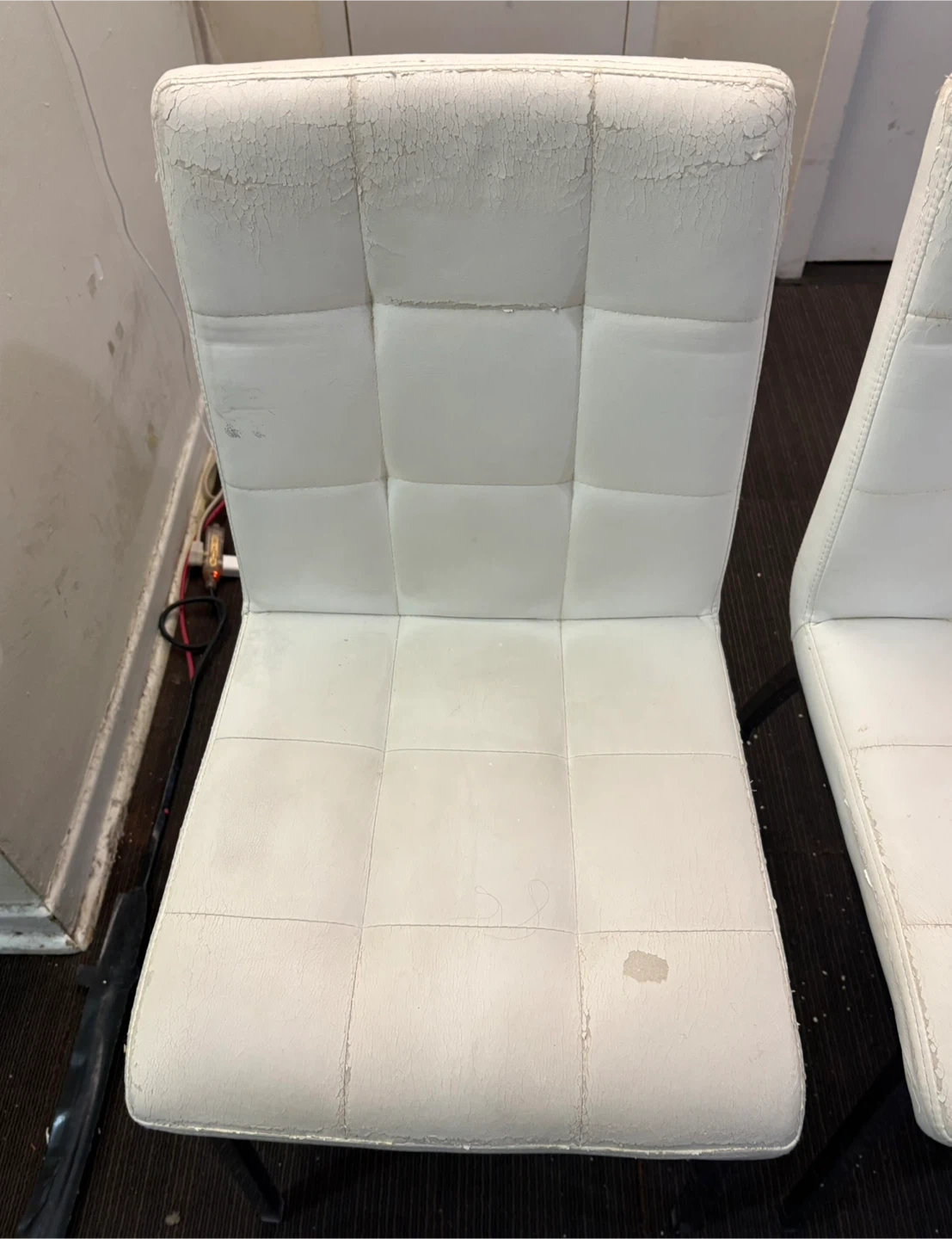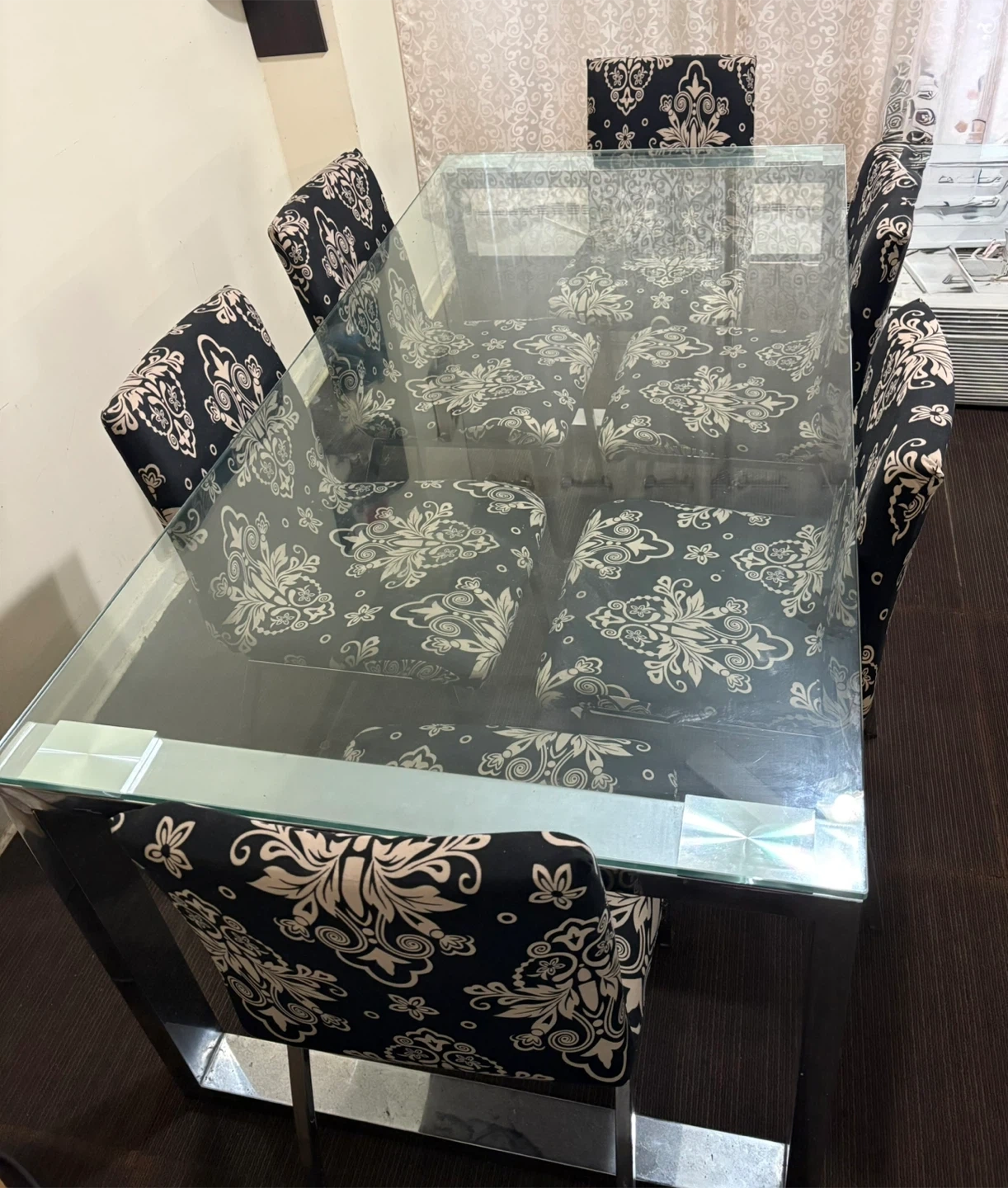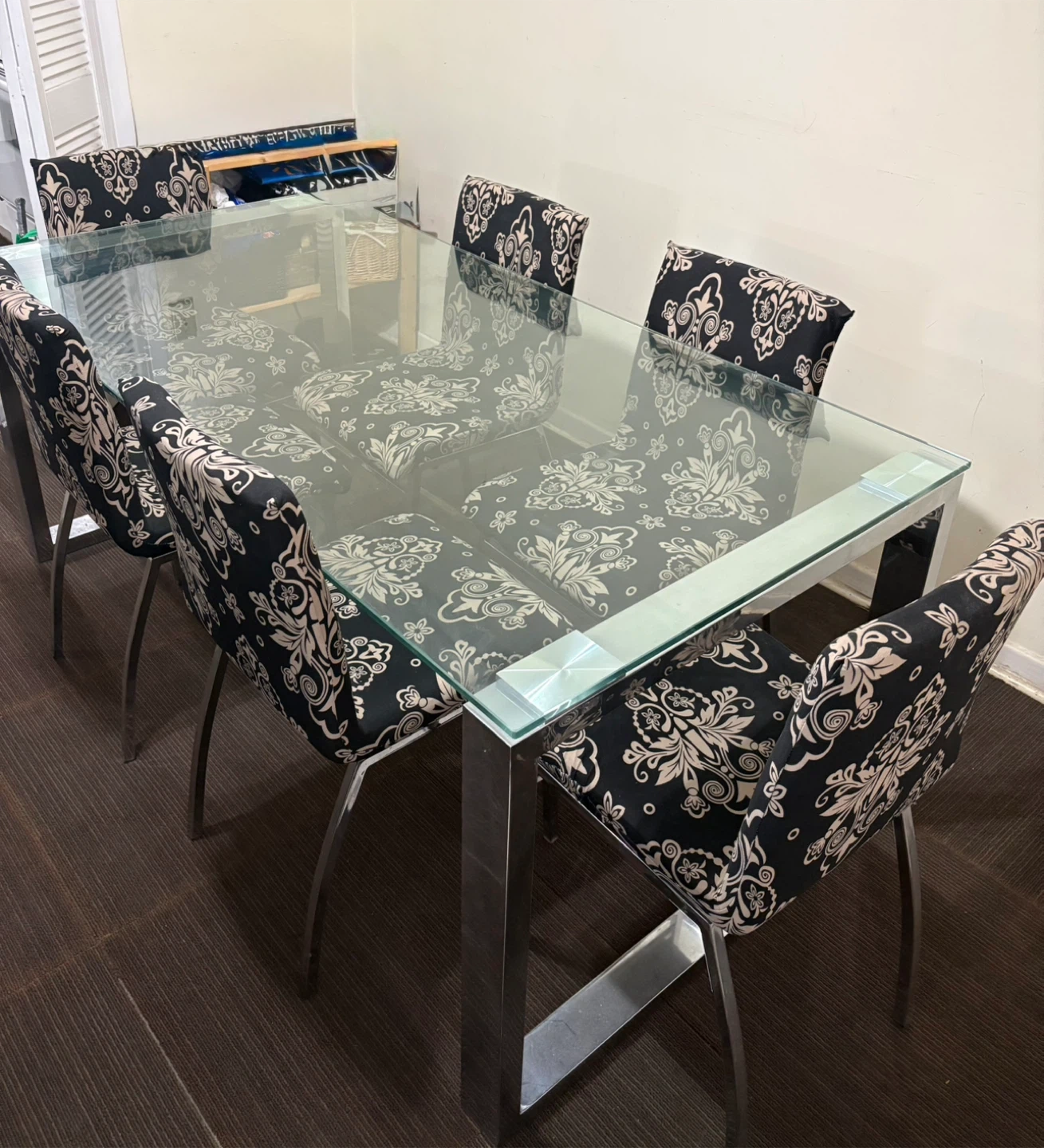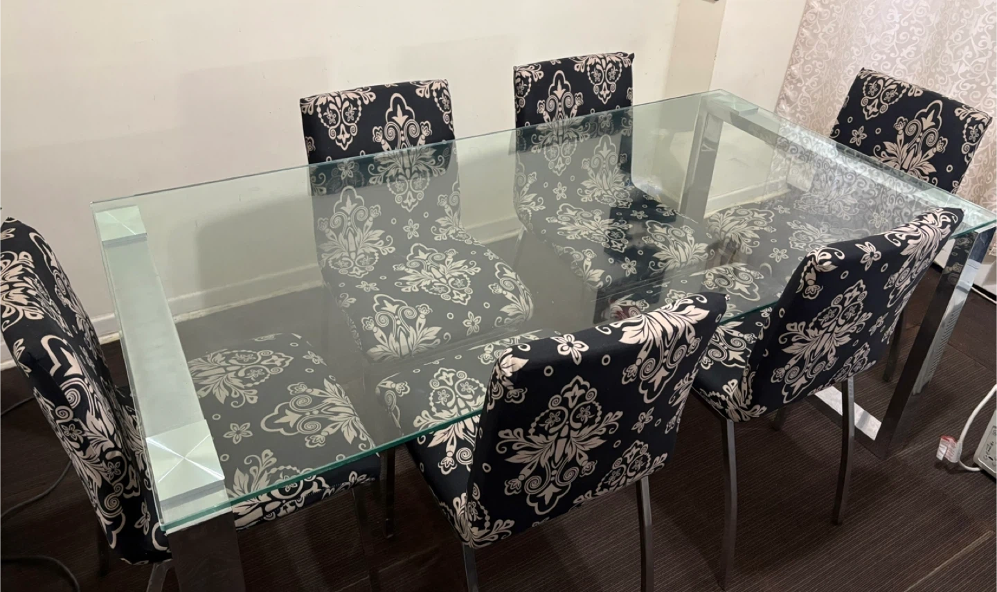 Selling a dining table set that includes a glass top table with chrome legs, and six chairs. The chairs have a black and white floral pattern cover on them, the actual chairs underneath are white leather but they are not in great condition (please refer to the pictures). The table is in great condition, the glass is perfect.