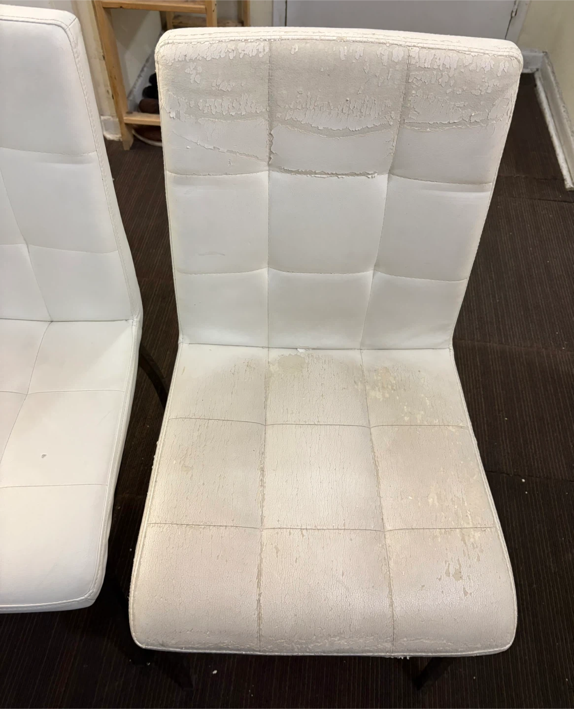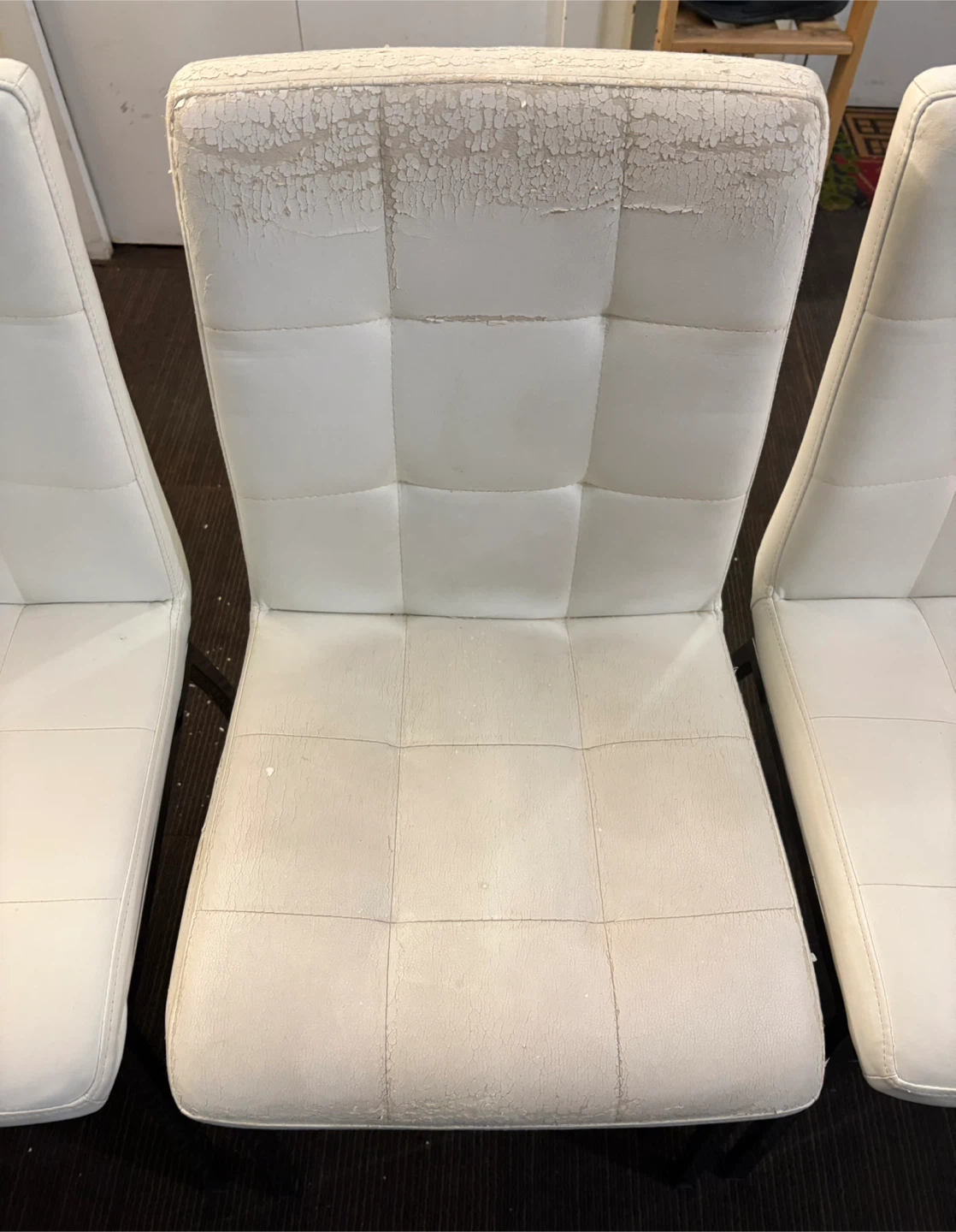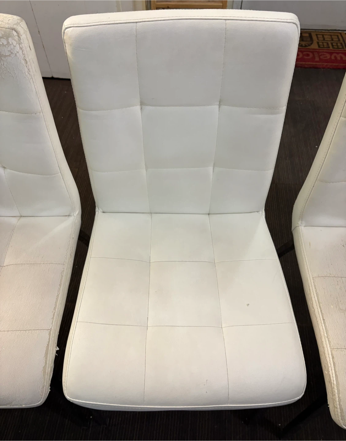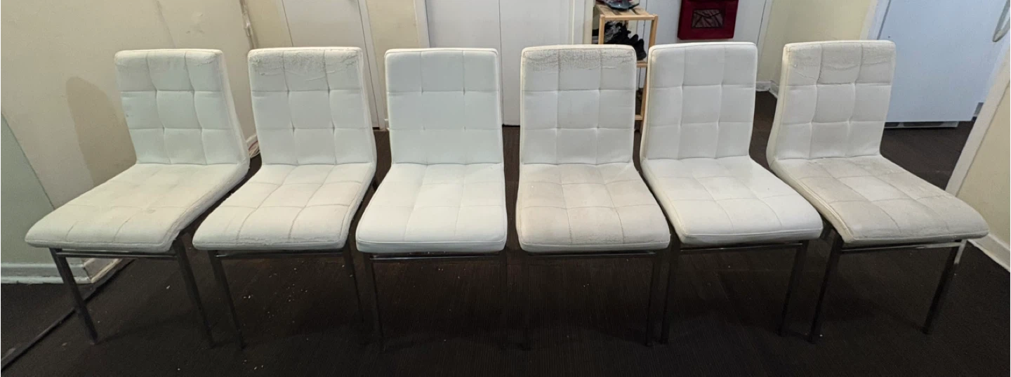 Selling a dining table set that includes a glass top table with chrome legs, and six chairs. The chairs have a black and white floral pattern cover on them, the actual chairs underneath are white leather but they are not in great condition (please refer to the pictures). The table is in great condition, the glass is perfect.