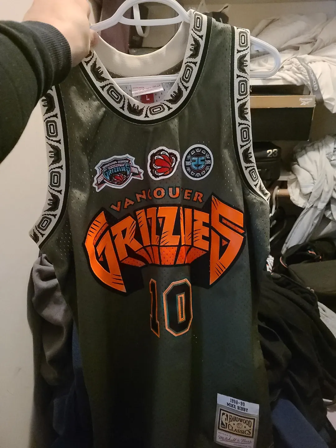 Mitchell & Ness Hardwood Classics jersey for the Vancouver Grizzlies, featuring Mike Bibby and the 1998-99 season details. Size is large.