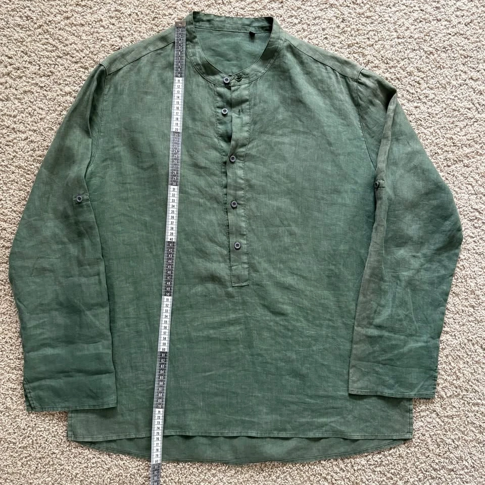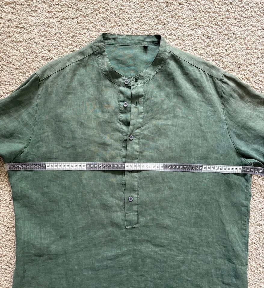 This airy, unstructured linen top is designed with comfort in mind. Whether worn over leggings, shorts for a picnic, or alone over a swim suit, this tunic is very versatile. Good pre-loved condition, with some discolouration on the sleeves as shown in the pictures. Women’s Size XXL 100% Linen Soft v-neck with long sleeves Relaxed fit – oversized, loose fit Extra button included Measurements are approx.: Length Front 75cm Length Back 80cm Pit to pit 62.5cm Sleeve 63cm Porch pick up west Maple Ridge.