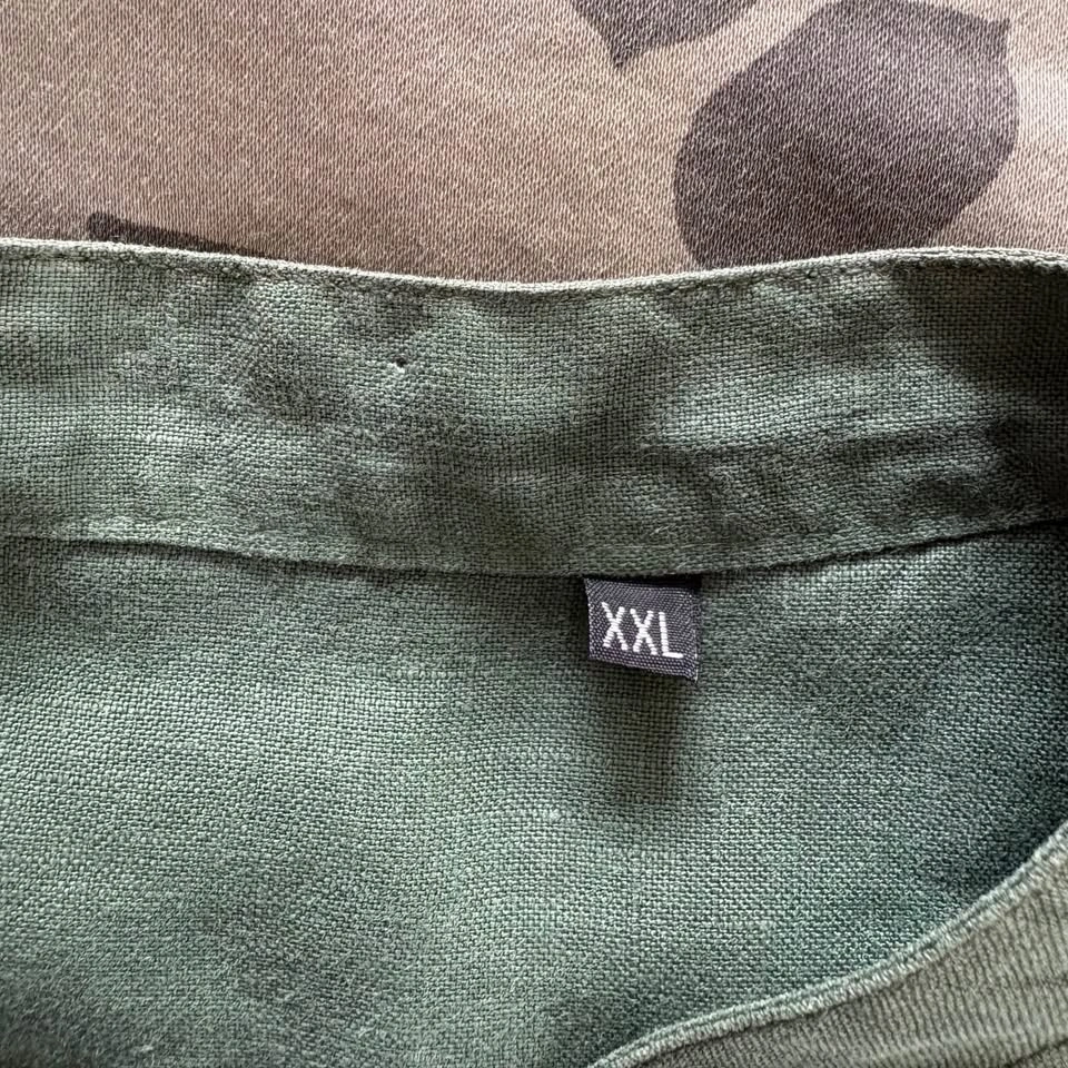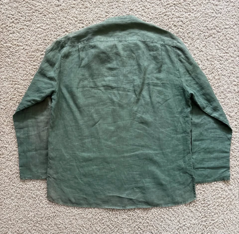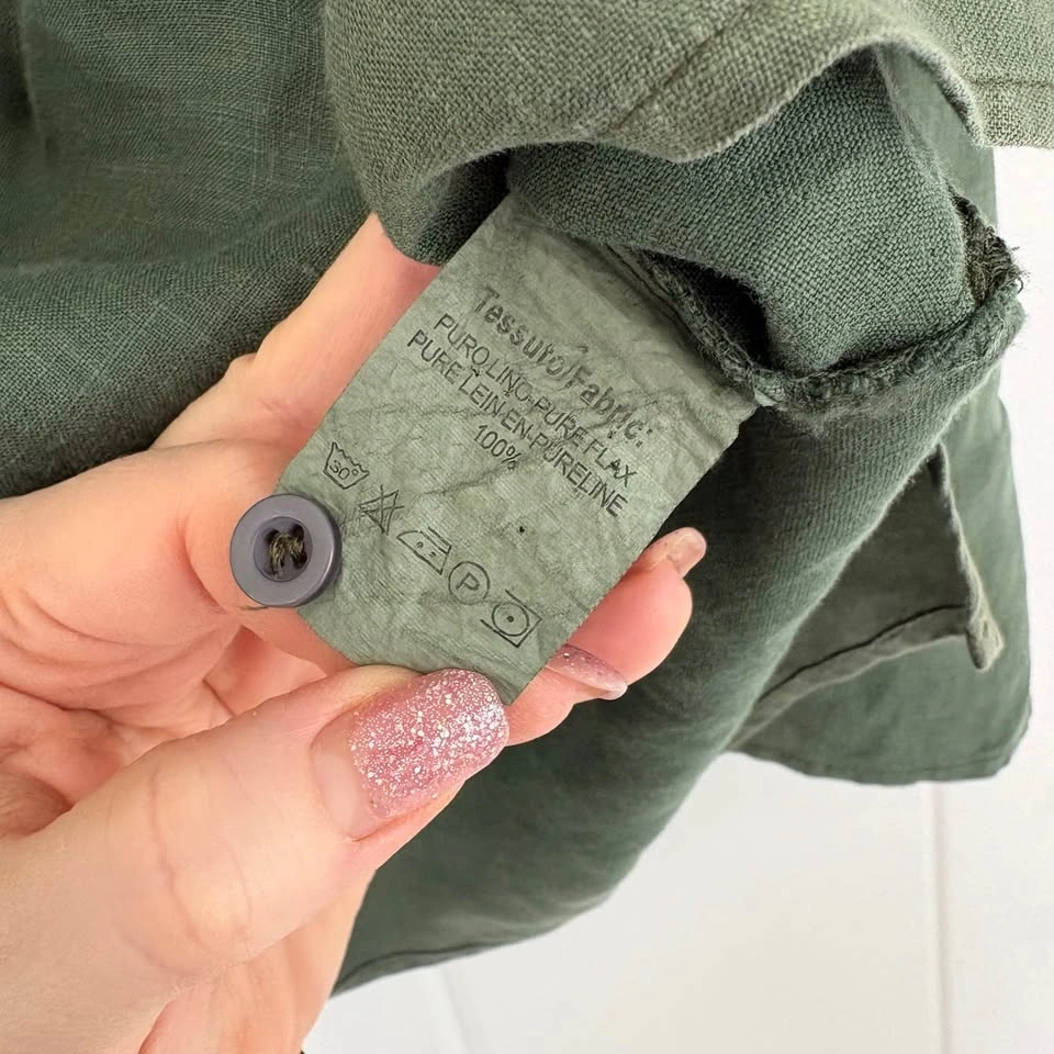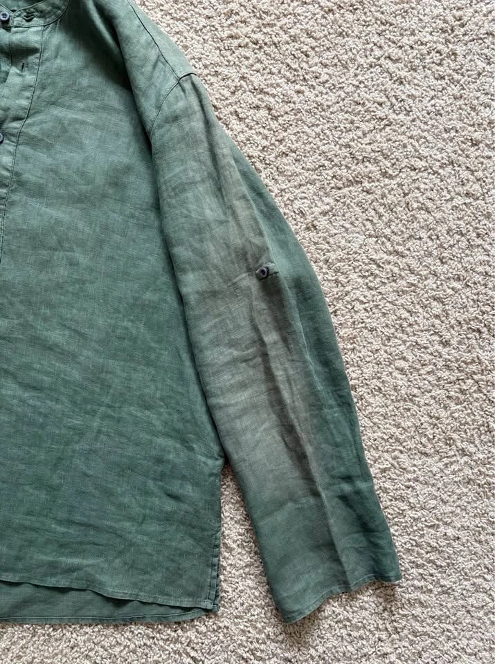 This airy, unstructured linen top is designed with comfort in mind. Whether worn over leggings, shorts for a picnic, or alone over a swim suit, this tunic is very versatile. Good pre-loved condition, with some discolouration on the sleeves as shown in the pictures. Women’s Size XXL 100% Linen Soft v-neck with long sleeves Relaxed fit – oversized, loose fit Extra button included Measurements are approx.: Length Front 75cm Length Back 80cm Pit to pit 62.5cm Sleeve 63cm Porch pick up west Maple Ridge.