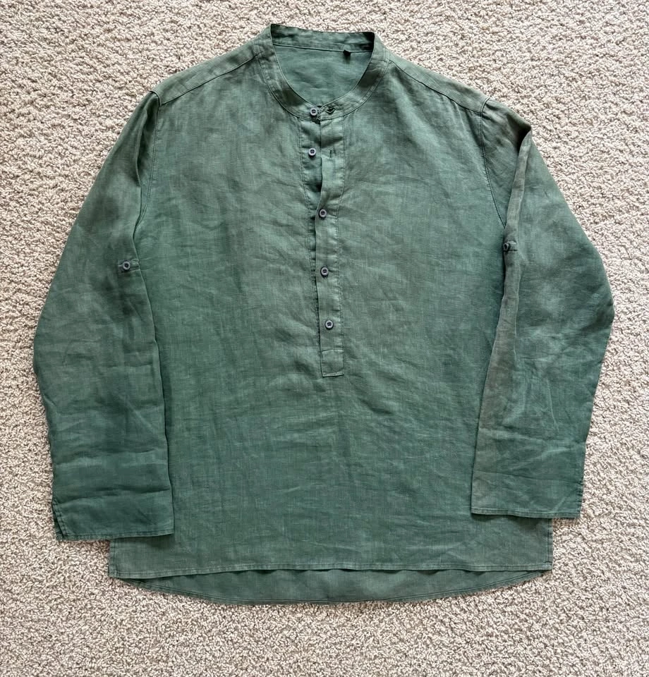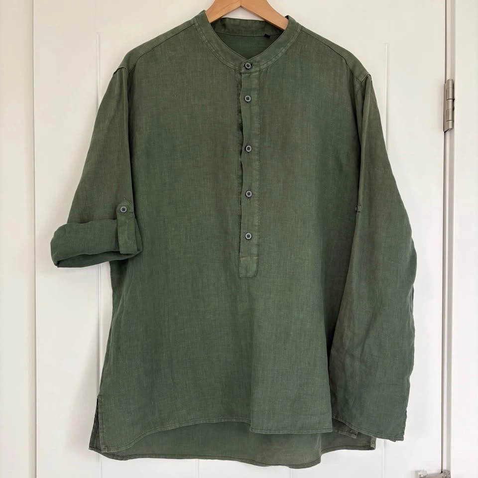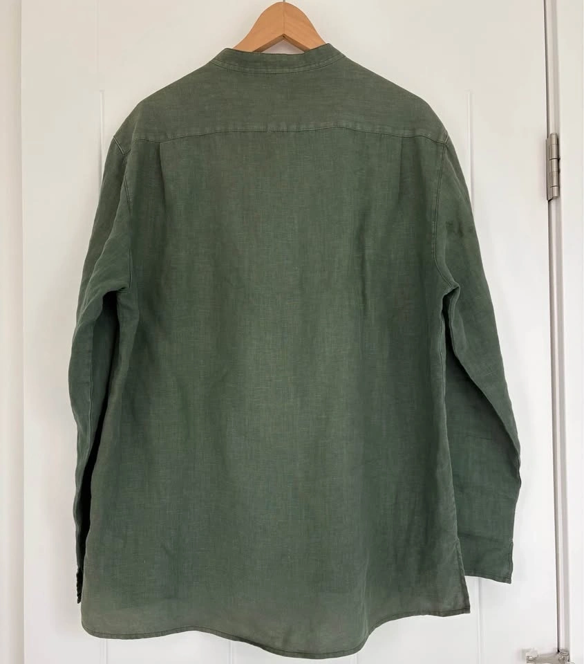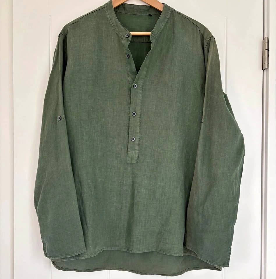 This airy, unstructured linen top is designed with comfort in mind. Whether worn over leggings, shorts for a picnic, or alone over a swim suit, this tunic is very versatile. Good pre-loved condition, with some discolouration on the sleeves as shown in the pictures. Women’s Size XXL 100% Linen Soft v-neck with long sleeves Relaxed fit – oversized, loose fit Extra button included Measurements are approx.: Length Front 75cm Length Back 80cm Pit to pit 62.5cm Sleeve 63cm Porch pick up west Maple Ridge.