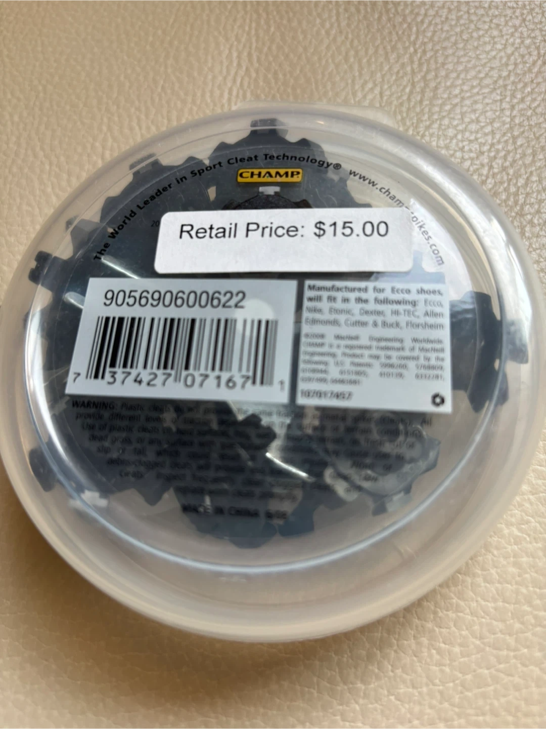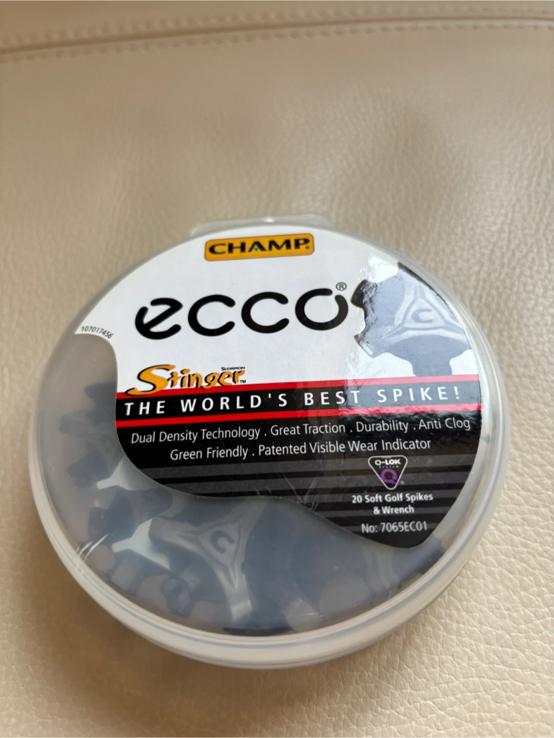 This set includes 14 Champ Stinger golf spikes and a wrench. They feature dual density technology for great traction and durability. They're designed to be anti-clog and have a green-friendly, patented visible wear indicator. These spikes will fit Ecco shoes and many other brands.