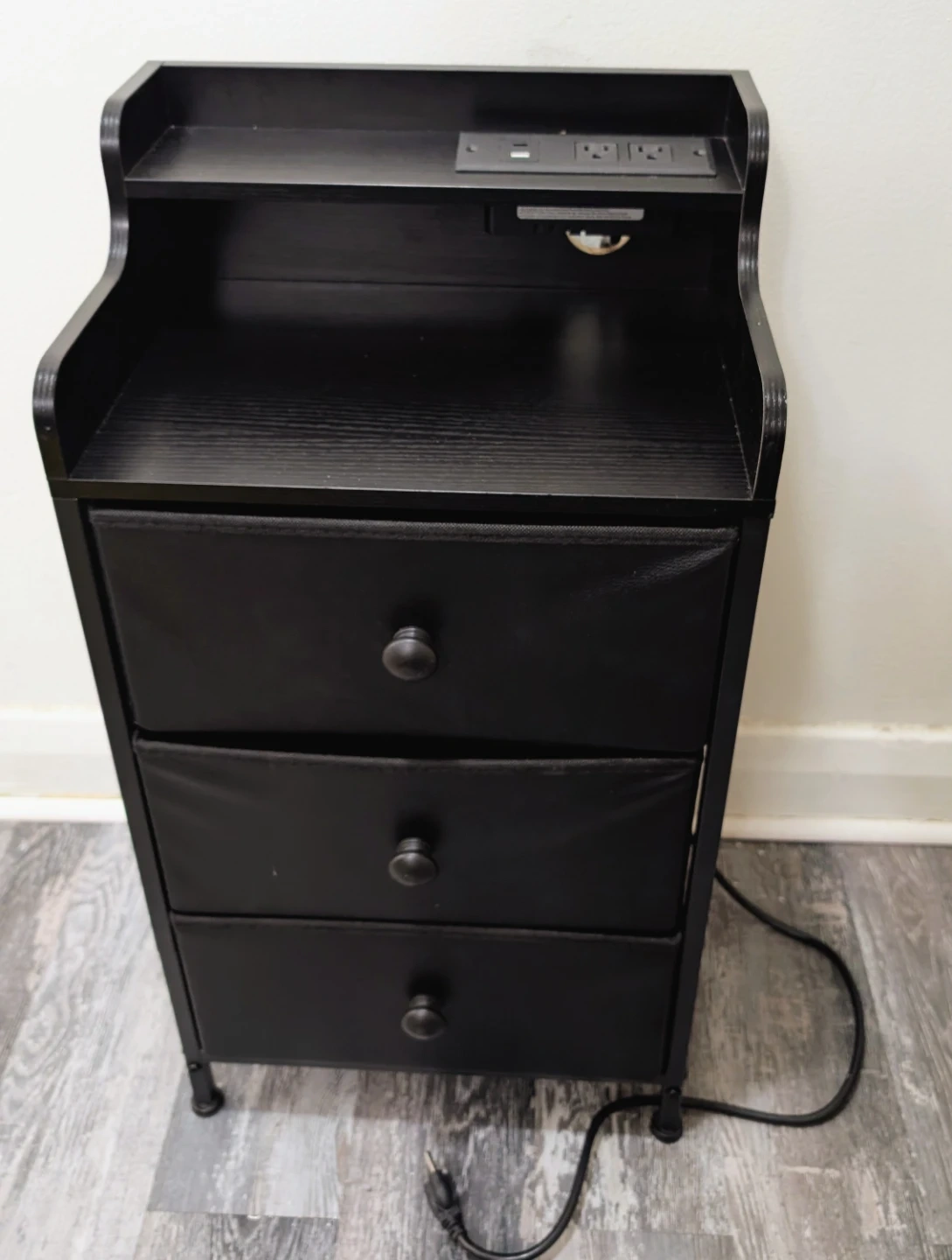 This black nightstand features a built-in charging station with USB C, USB ports and outlets. It has three fabric drawers for storage and a tiered shelf. The compact design is great for small spaces. It's convenient for keeping electronics charged right by your bed!