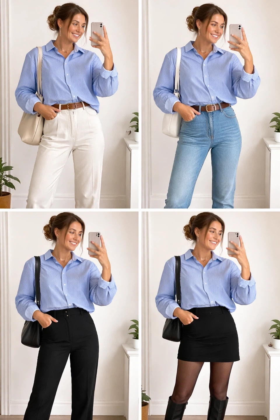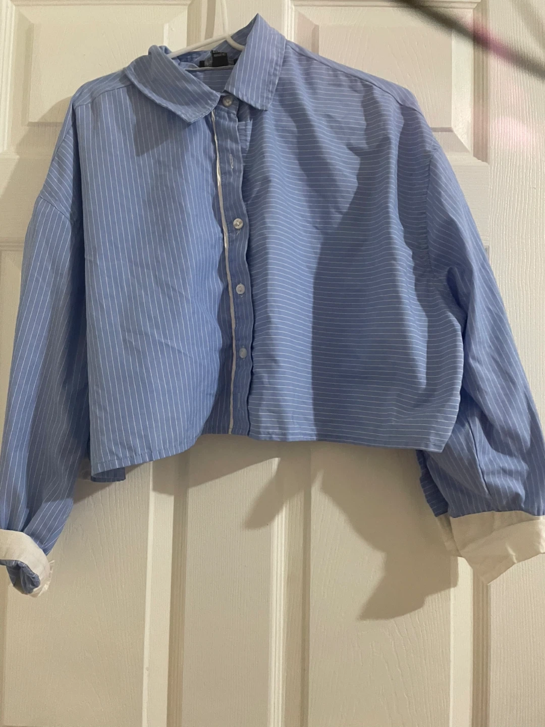 Here's a cute blue and white striped button-down shirt! It's perfect for a casual look or dressing up. The shirt features long sleeves with white cuffs and a classic collar. It's in great condition and ready for a new home!
