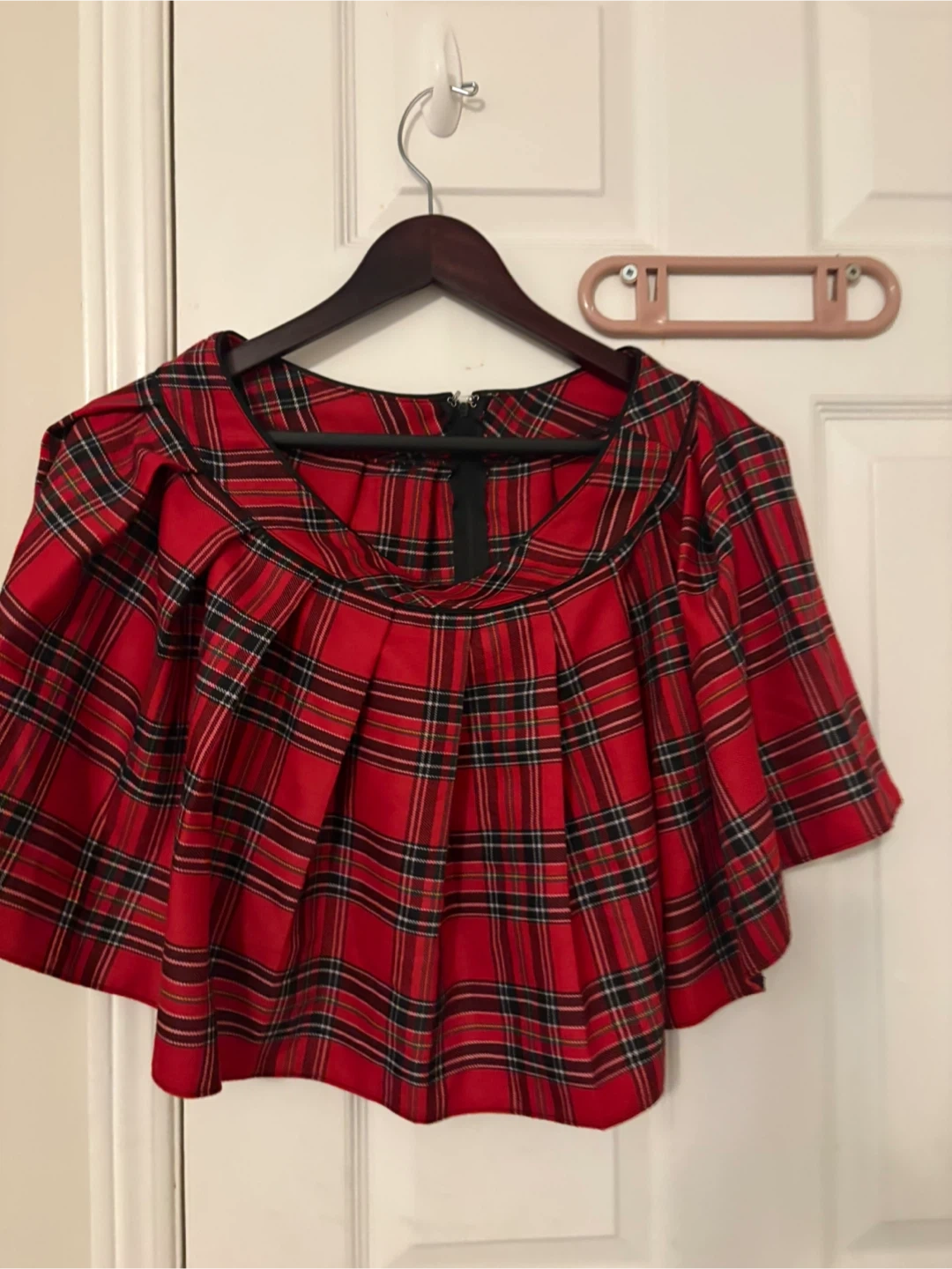 A stylish red plaid mini skirt with pleats. It features a black trim around the neckline and a back zipper closure. This skirt is made of polyester and is a size medium. It's perfect for a casual outing or can be dressed up for a festive occasion! Worn once.