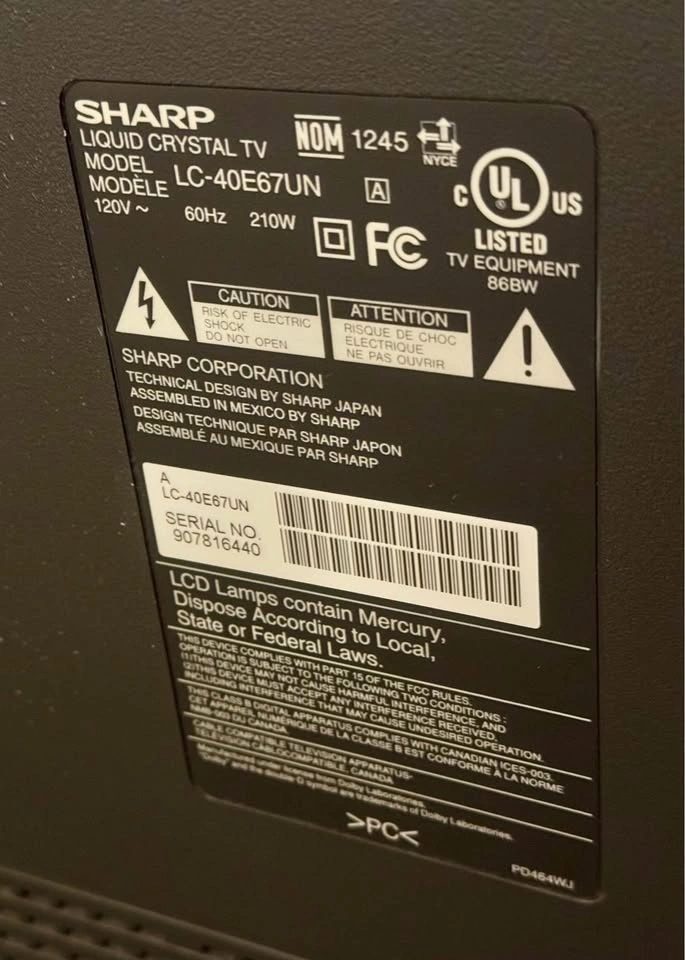 Selling a Sharp 40-inch LCD TV in good working condition. Sharp is well known for producing reliable TVs with clear picture quality and solid build.
