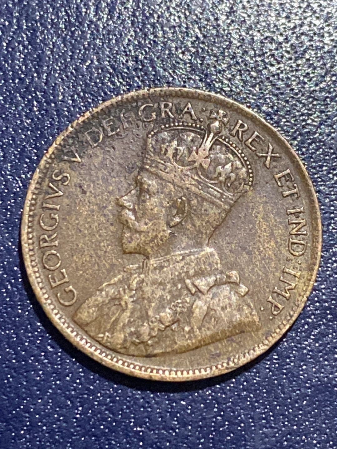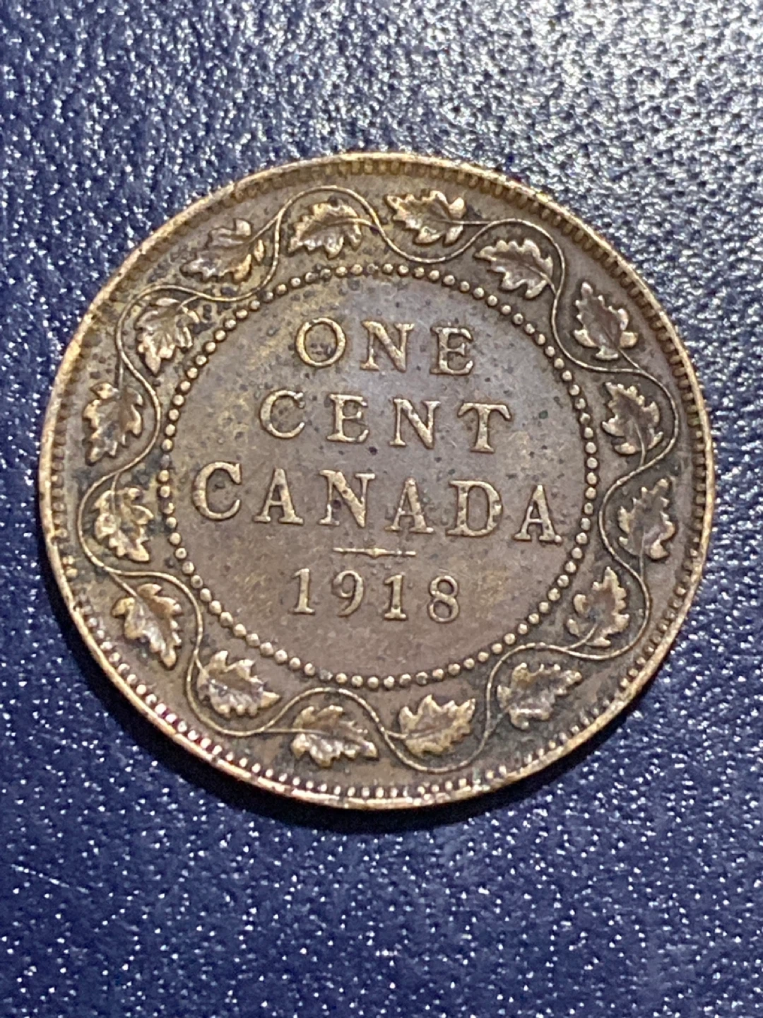 This is a 1918 Canadian one cent coin featuring King George V. It's a copper coin with a detailed obverse and reverse design. A neat piece of Canadian numismatic history!