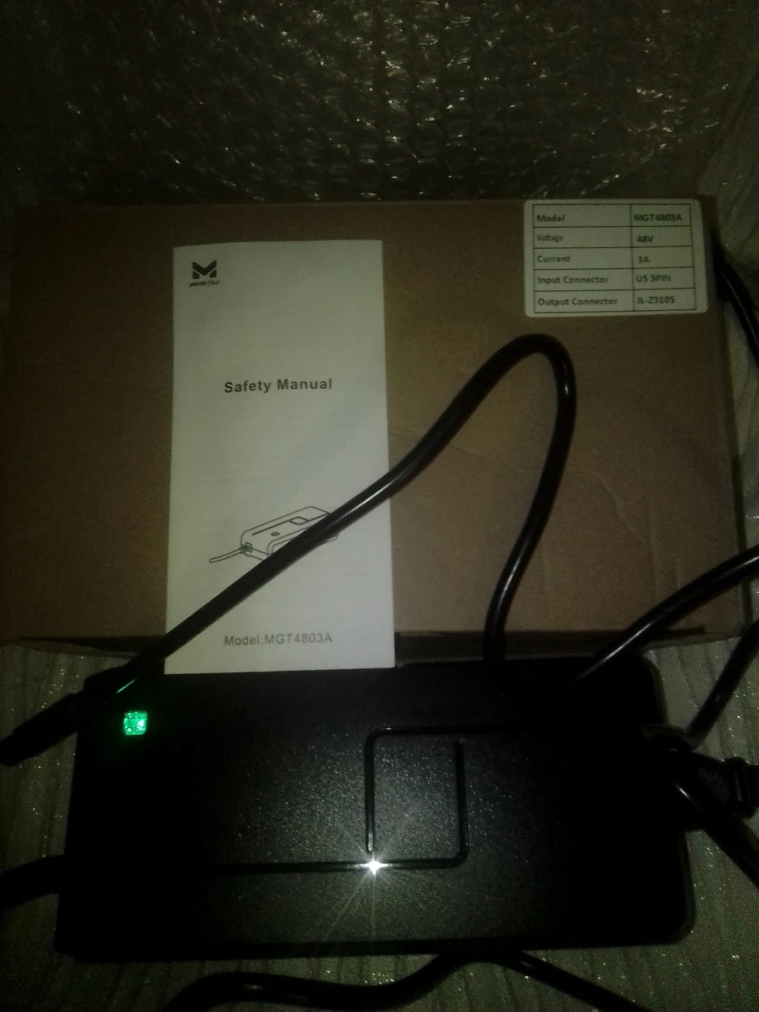 This is a New MGT4803A power charger. It operates at 48V and has a 3A current rating. The input connector is US 3PIN. It's designed for charging devices that require these specifications.
