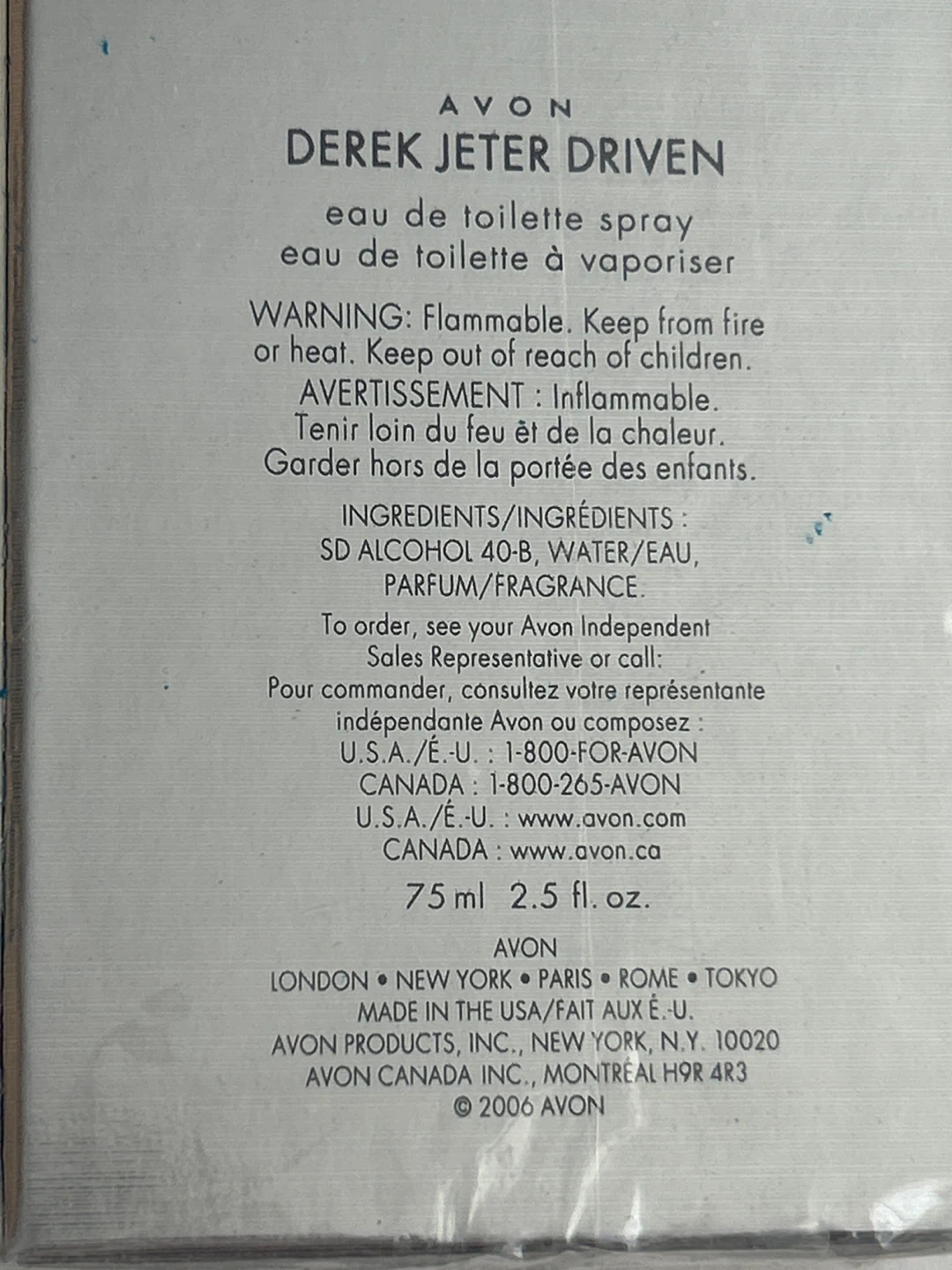 This is a new, sealed bottle of Avon Derek Jeter Driven eau de toilette spray. It's a 75 ml (2.5 fl. oz.) size. The scent is a parfum/fragrance blend.