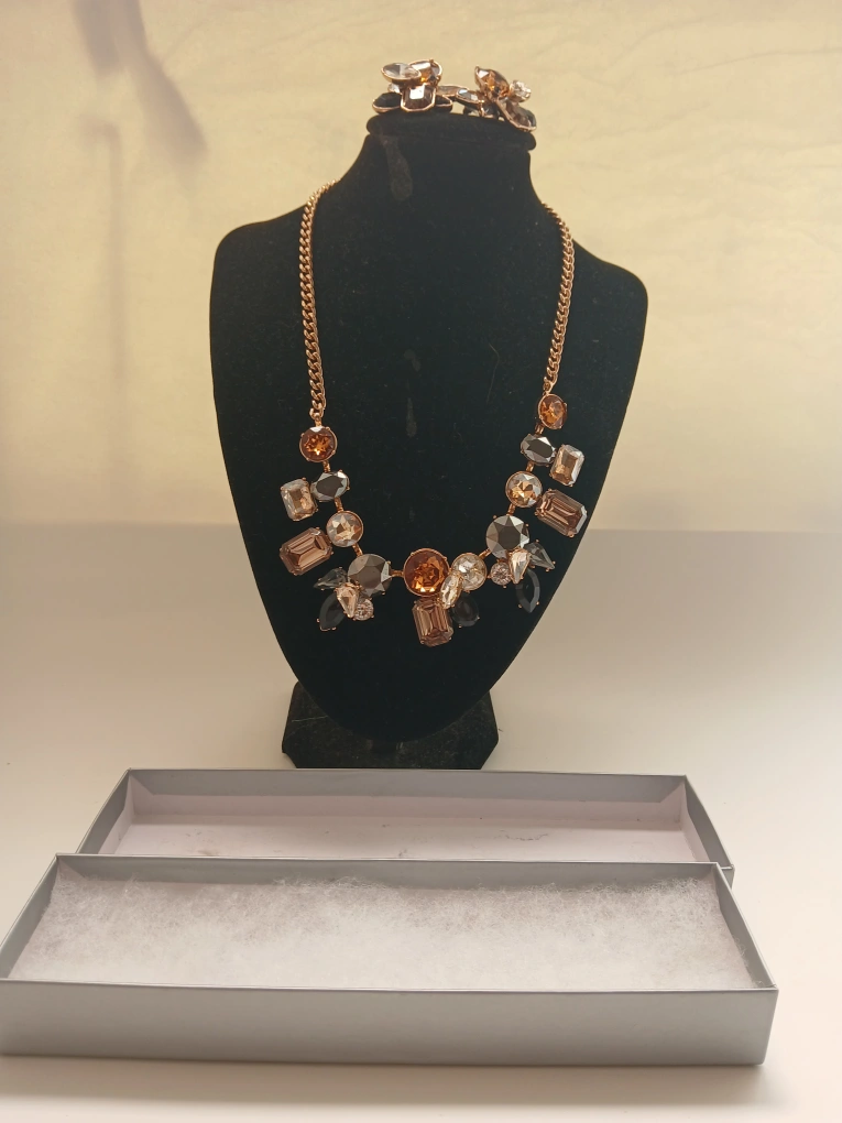 Selling a beautiful necklace and earrings set! The set features a mix of brown, gold,grey and clear stones. It comes with its original box, so it would make a lovely gift for someone special .