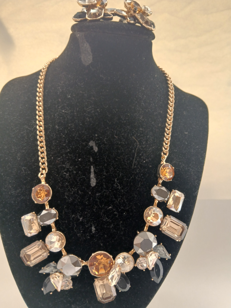 Selling a beautiful necklace and earrings set! The set features a mix of brown, gold,grey and clear stones. It comes with its original box, so it would make a lovely gift for someone special .