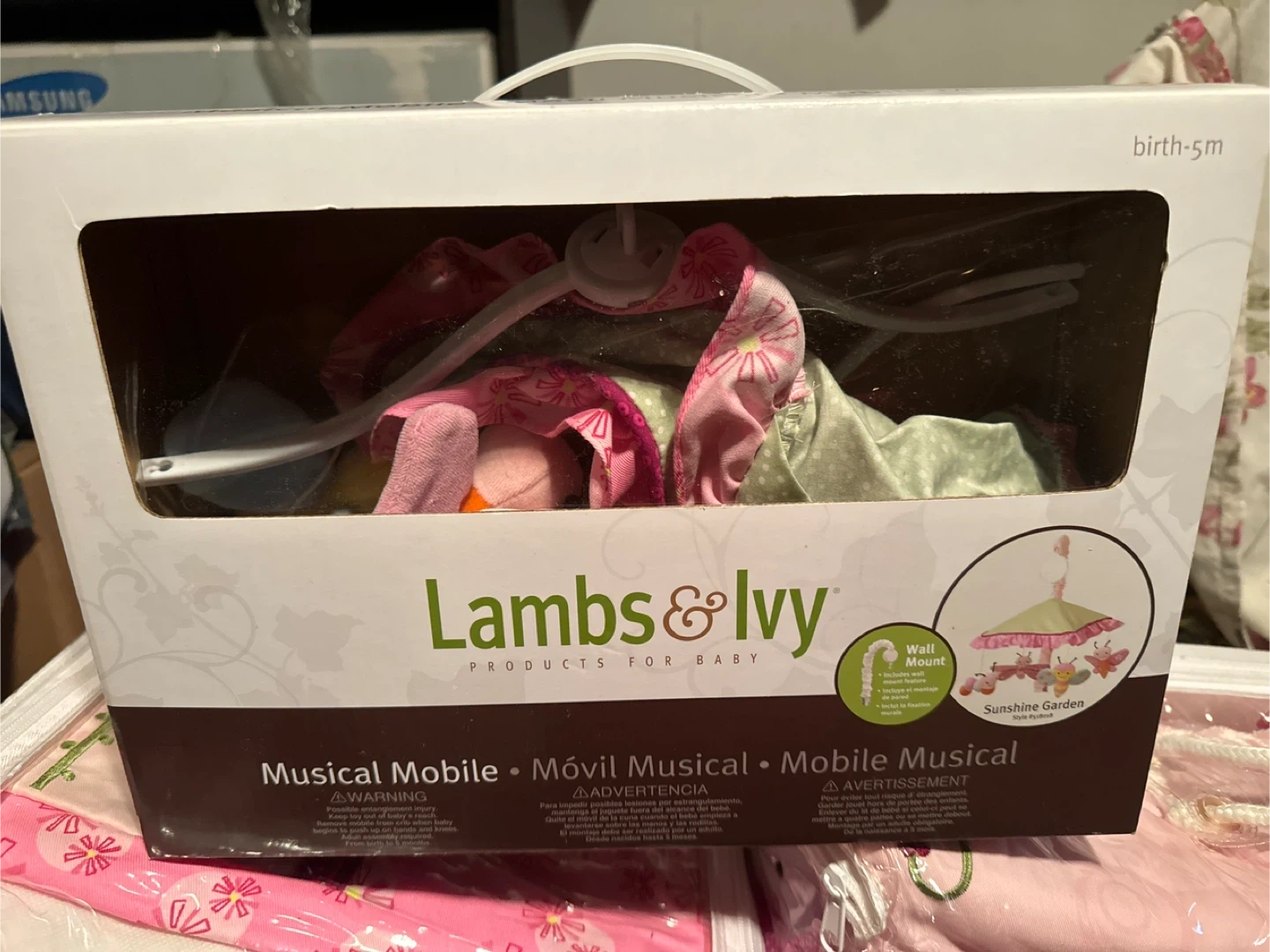 This is a Lambs & Ivy Musical Mobile from the Sunshine Garden collection. It's designed for babies birth to 5 months. Includes a wall mount attachment.