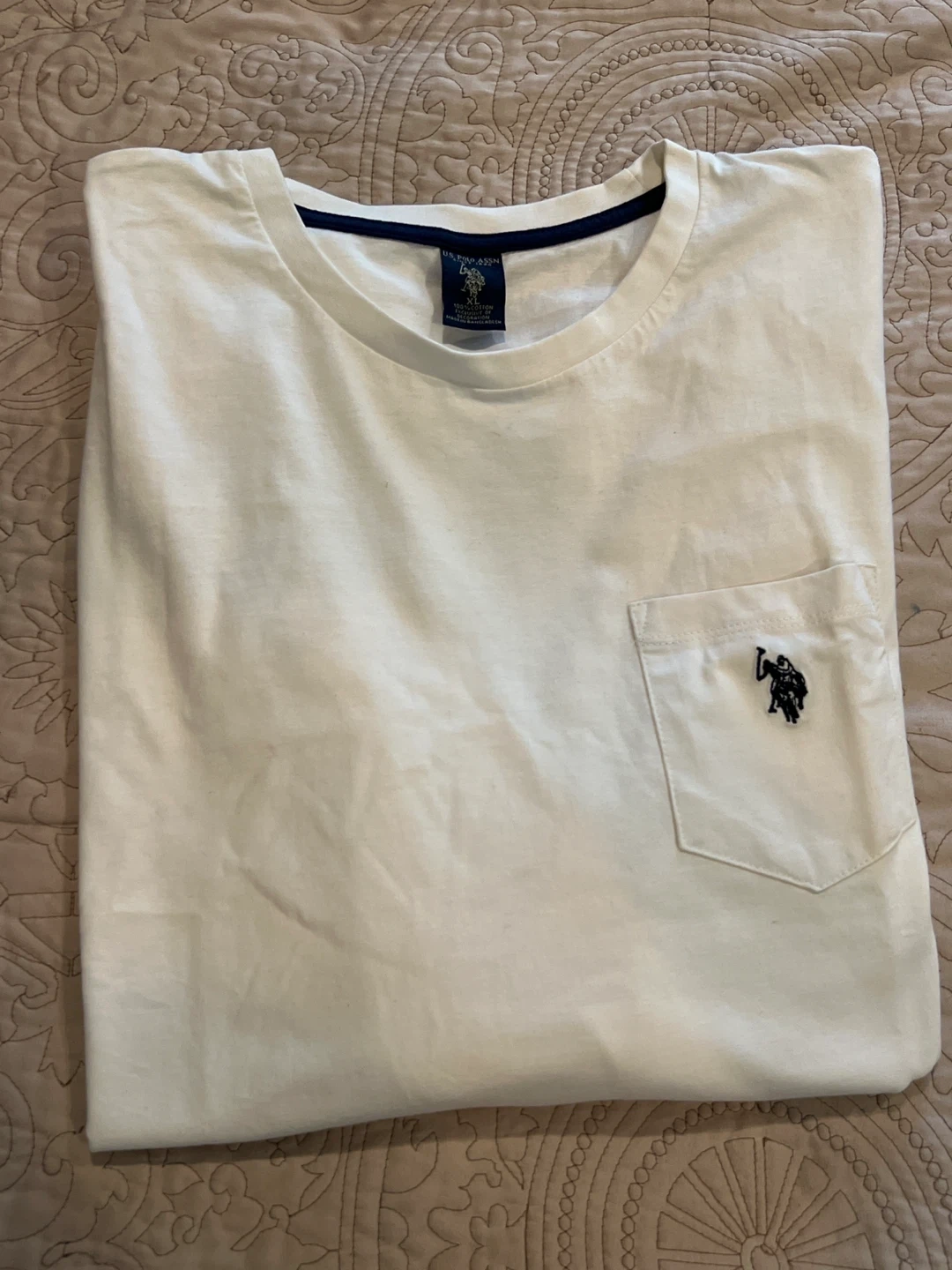 This U.S. Polo Assn. long sleeve t-shirt is white with a chest pocket. It's 100% cotton. Made in Bangladesh. A comfortable everyday basic!