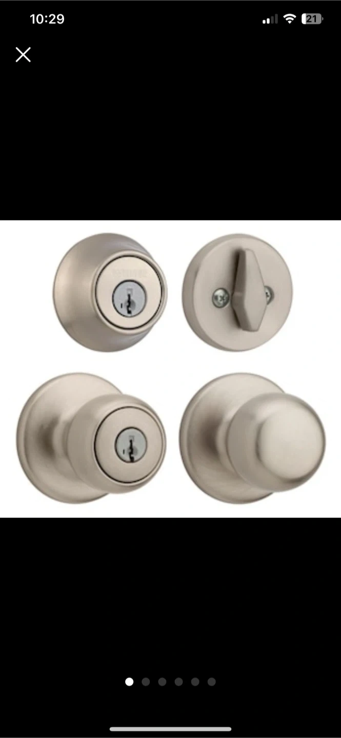 This is a brushed nickel Weiser deadbolt and doorknob set. Includes interior thumbturn and exterior keys. Great for securing your home's entry points!