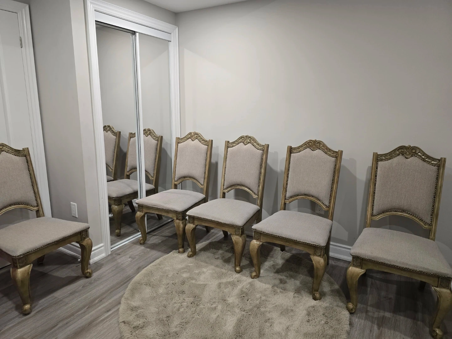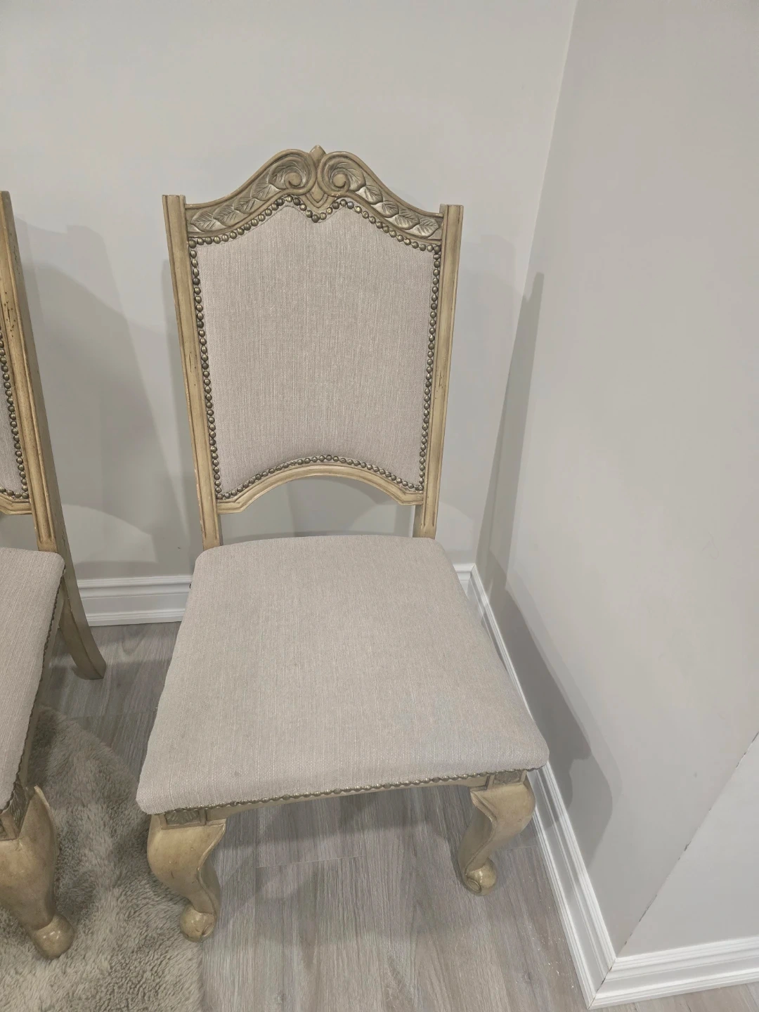 These five dining/breakfast chairs feature a classic design with upholstered seats and backs. They have decorative nailhead trim and ornate carved wooden frames. They're perfect for adding a touch of sophistication to your dining room, breakfast set, or any seating area.