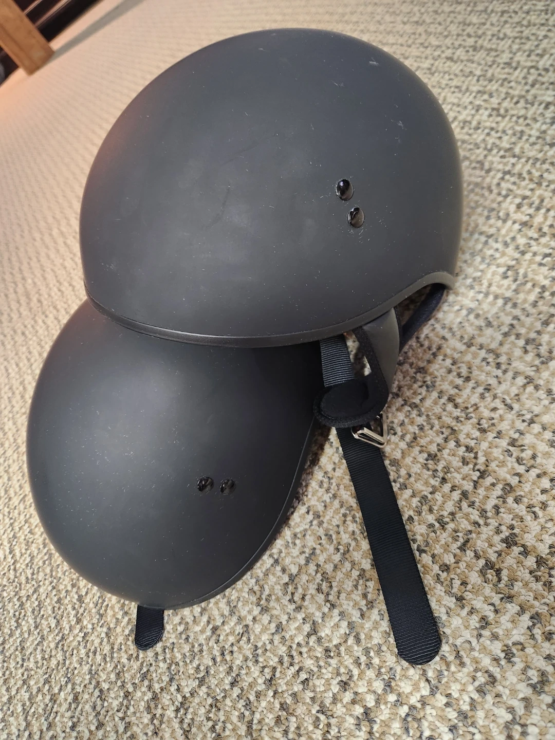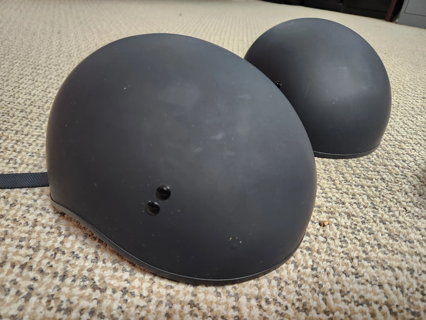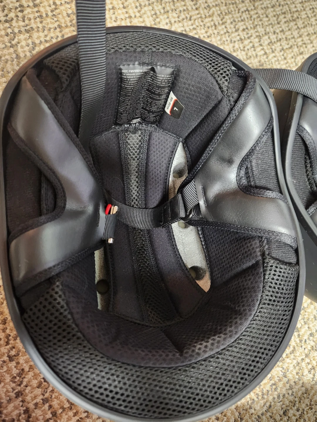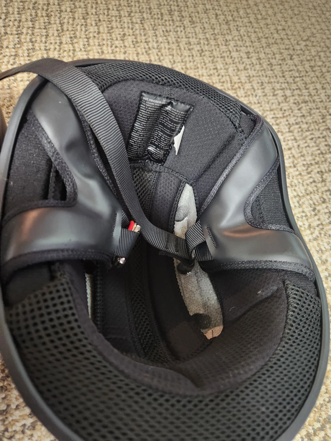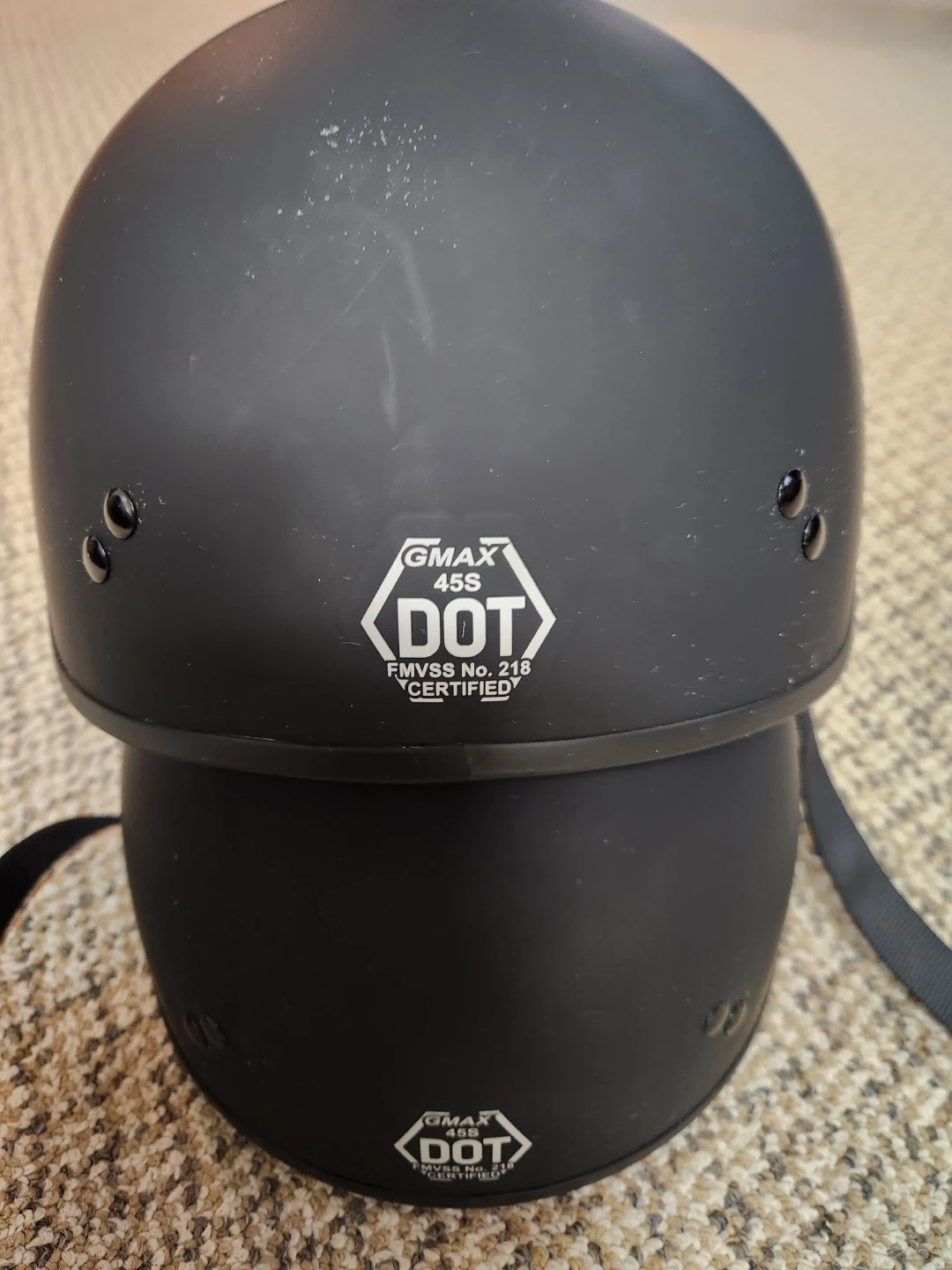 GMAX DOT certified motorcycle helmet in matte black. Meets FMVSS No. 218 standards. Interior lining is present and straps are adjustable. Size is marked as L.