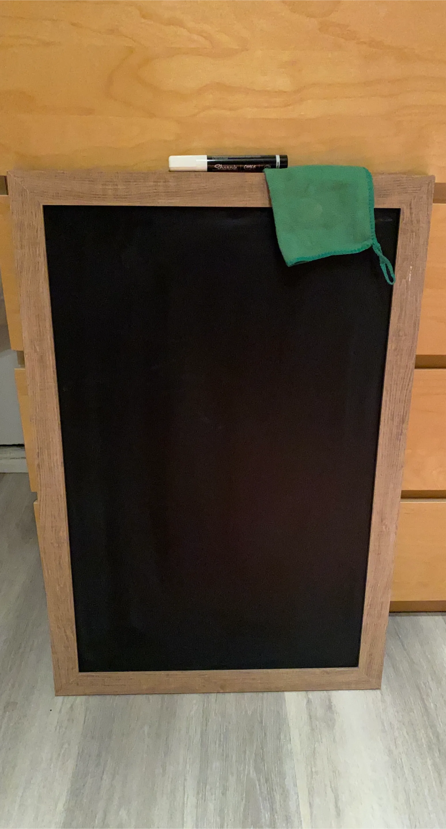 Selling a chalkboard with a wooden frame. It comes with a Sharpie chalk marker and a green cloth eraser. The other side has a whiteboard. It's in good condition and ready for your creative ideas!