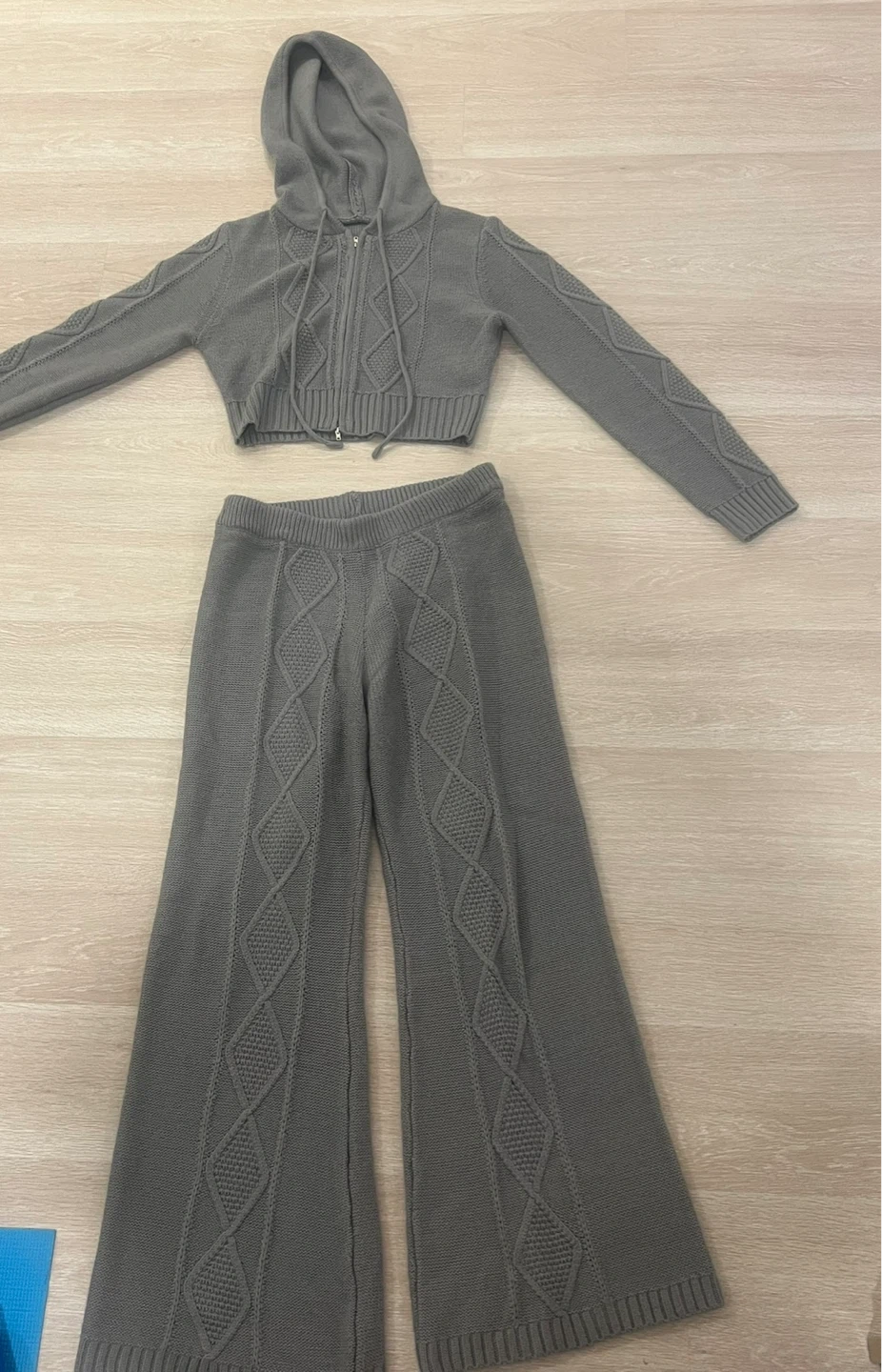 Cozy grey knit set featuring a cropped zip-up hoodie with a hood and matching flare pants. Both pieces have a cable knit pattern throughout. This two-piece outfit offers a relaxed yet stylish look. Perfect for casual wear or lounging! Size M for both.
