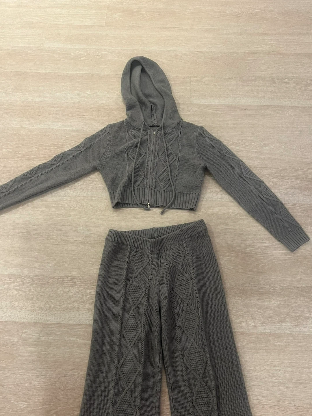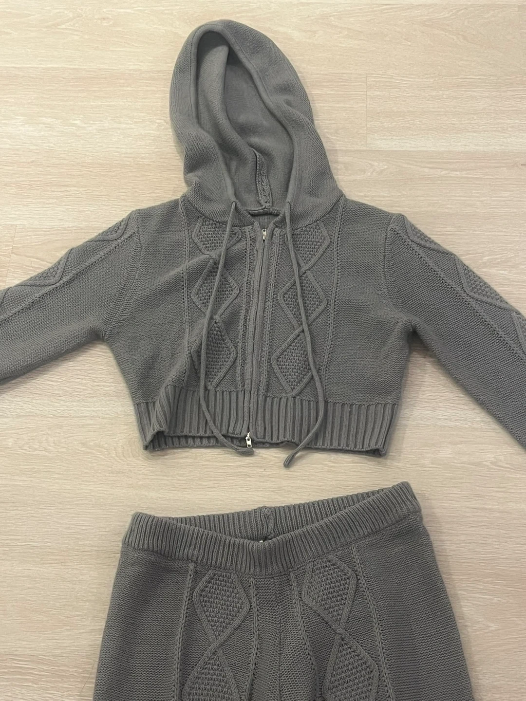 Cozy grey knit set featuring a cropped zip-up hoodie with a hood and matching flare pants. Both pieces have a cable knit pattern throughout. This two-piece outfit offers a relaxed yet stylish look. Perfect for casual wear or lounging! Size M for both.
