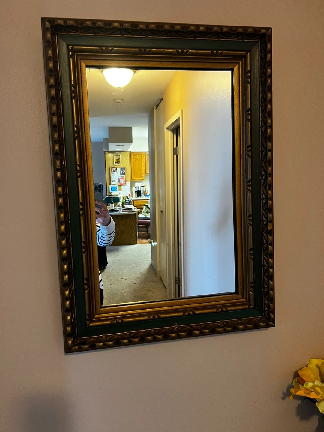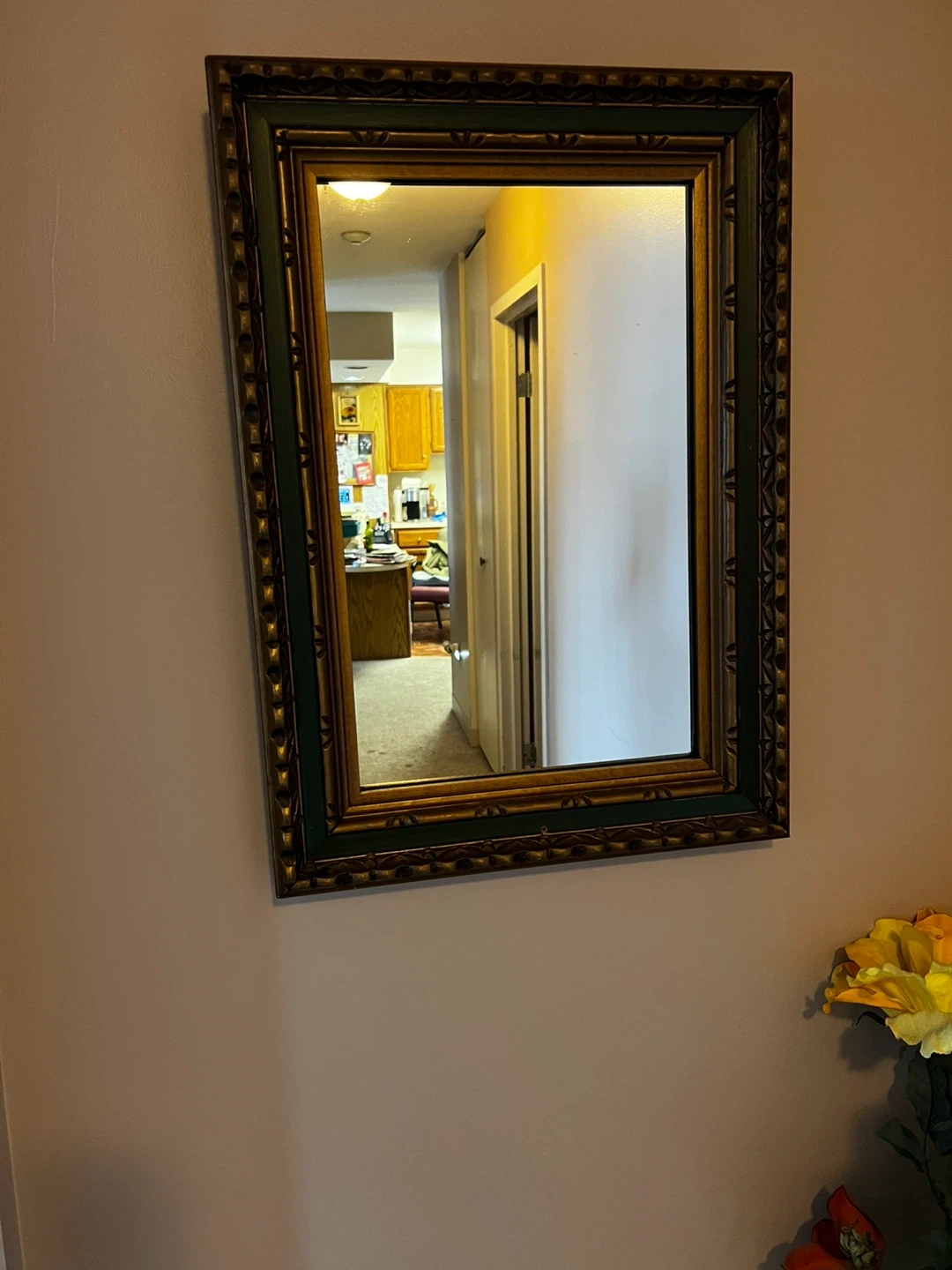 Selling a framed wall mirror. The frame is a dark green and gold color. It would be a great addition to any room