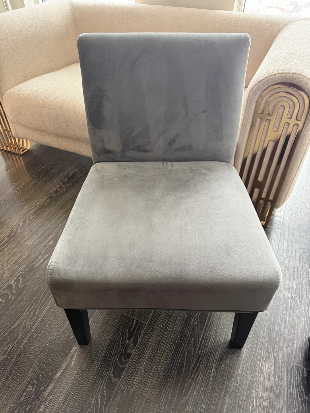 2 chairs: This is a stylish grey velvet dining chair. It has a comfortable cushioned seat and back. The legs are made of dark wood. Perfect for adding a touch of elegance to any dining room!
