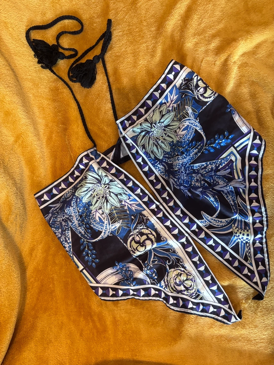 A decorative satin top featuring a blue, white, and purple floral pattern. It has black braided ties with tassels for closure.