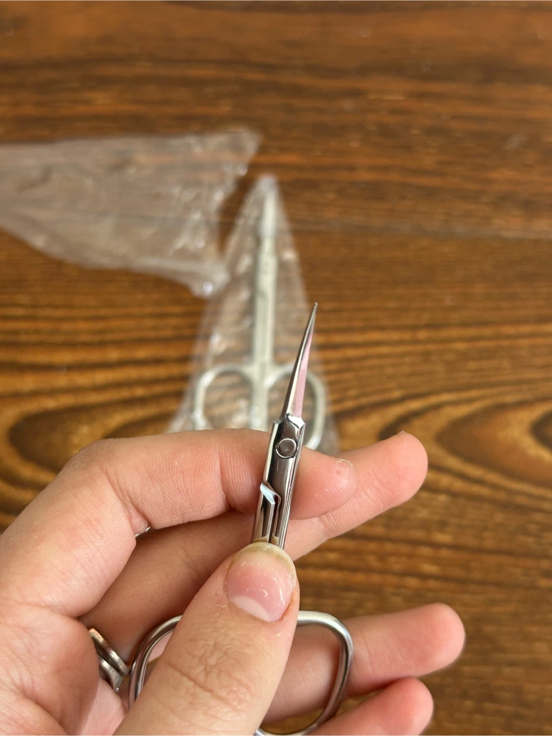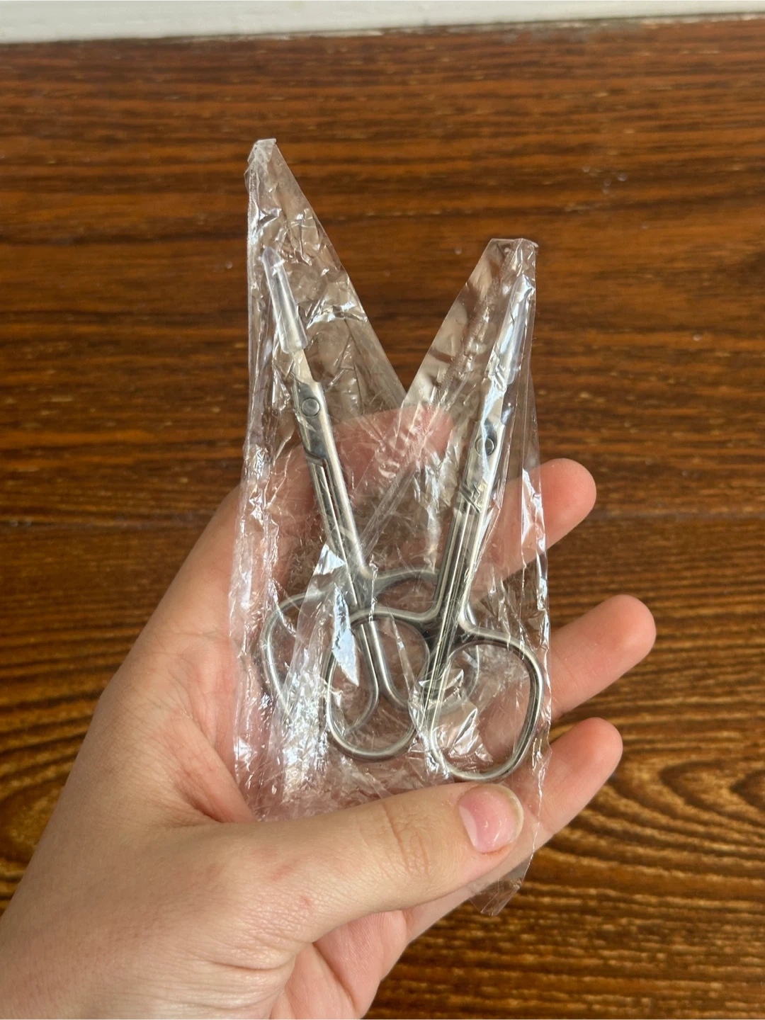 This is a pair of small grooming scissors, perfect for detail work. Made of stainless steel, they come with a protective cap for the tip. They're handy for trimming nails or other precise grooming tasks.