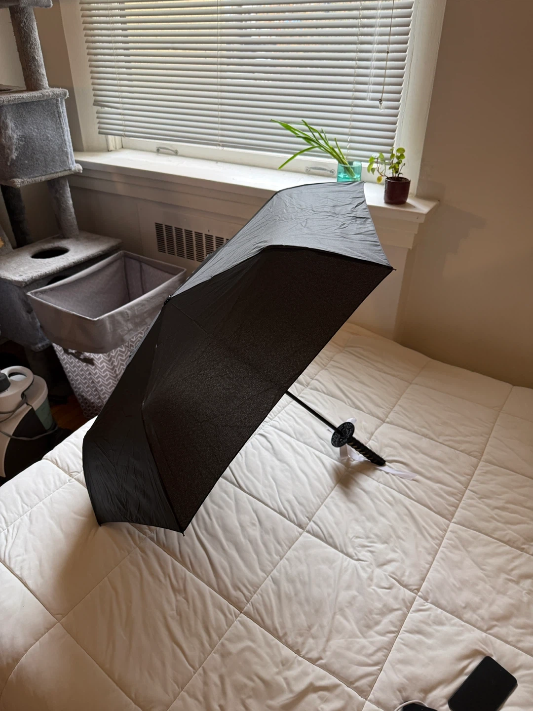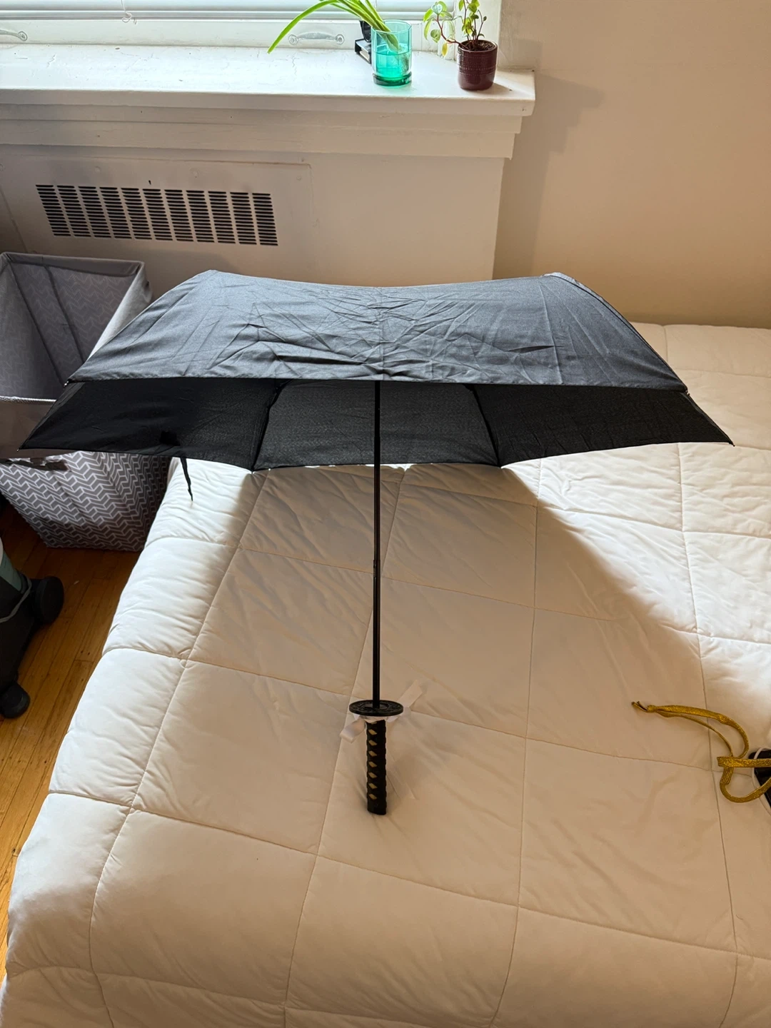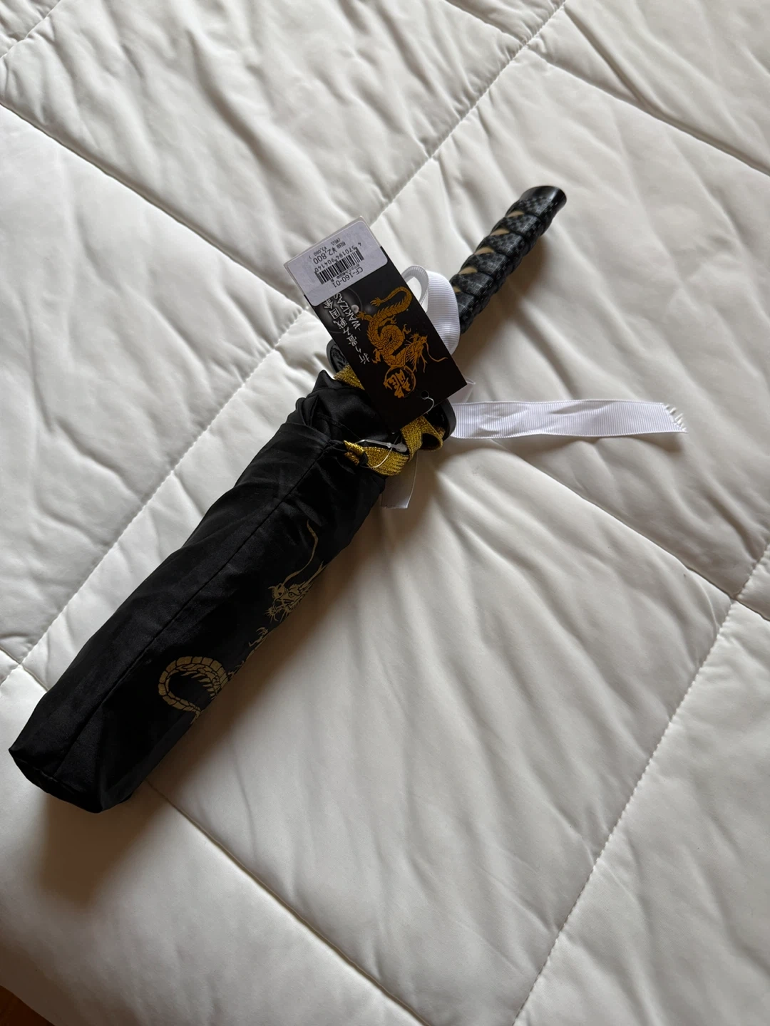 Check out this unique umbrella with a samurai sword handle! It's black and in great condition. Perfect for adding a bit of flair to rainy days
