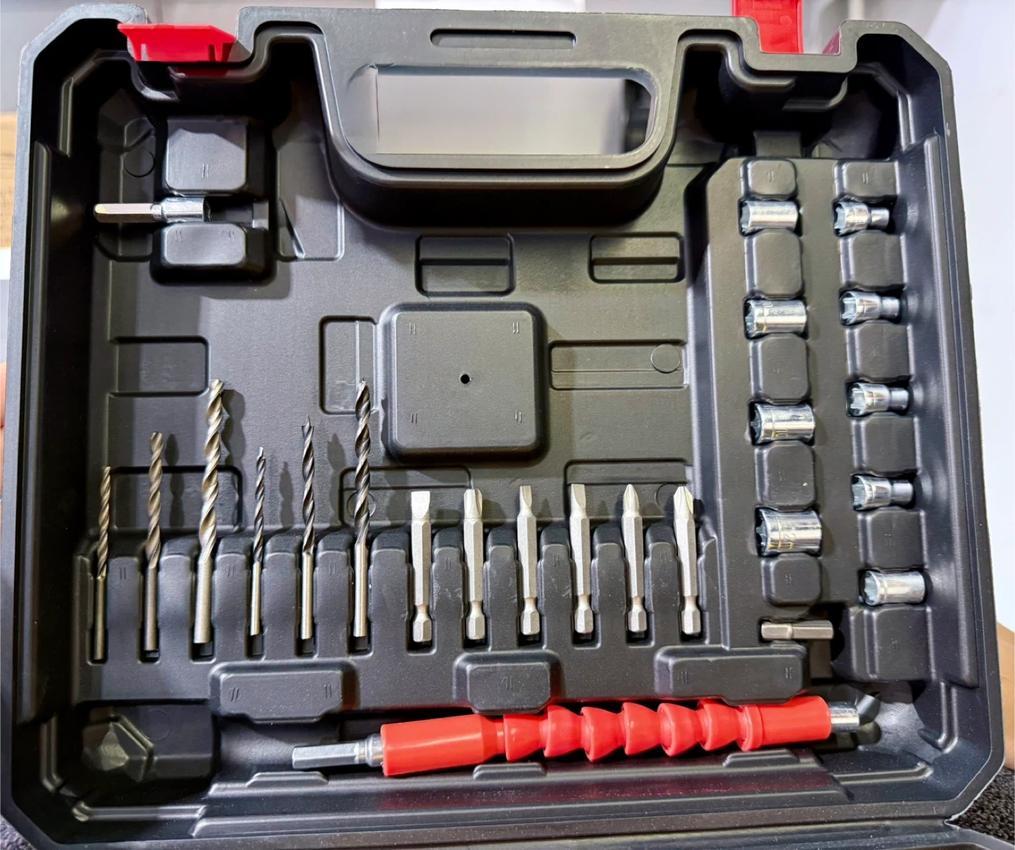 This Tuddy cordless electric drill comes with two batteries and a charger. It includes a variety of drill bits and socket attachments in a durable carrying case. Variable speed up to 1150 RPM.