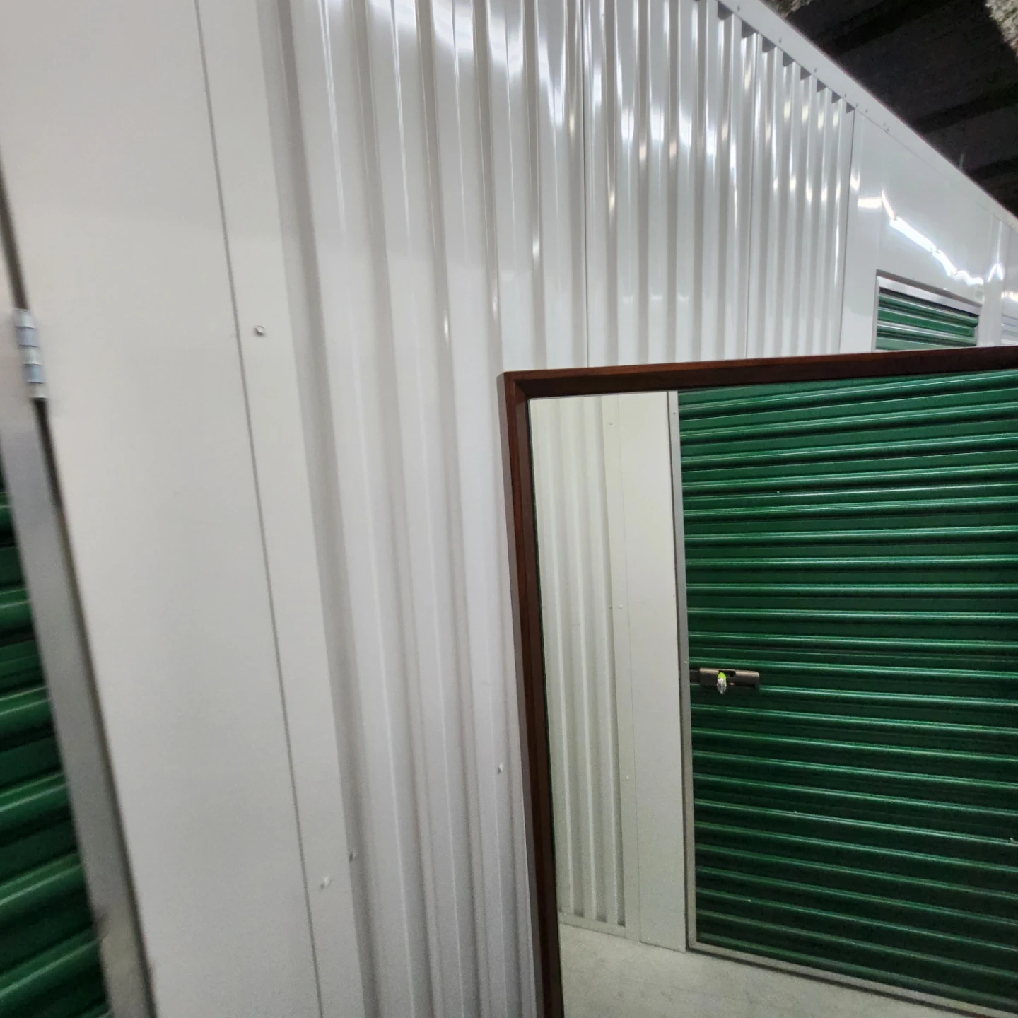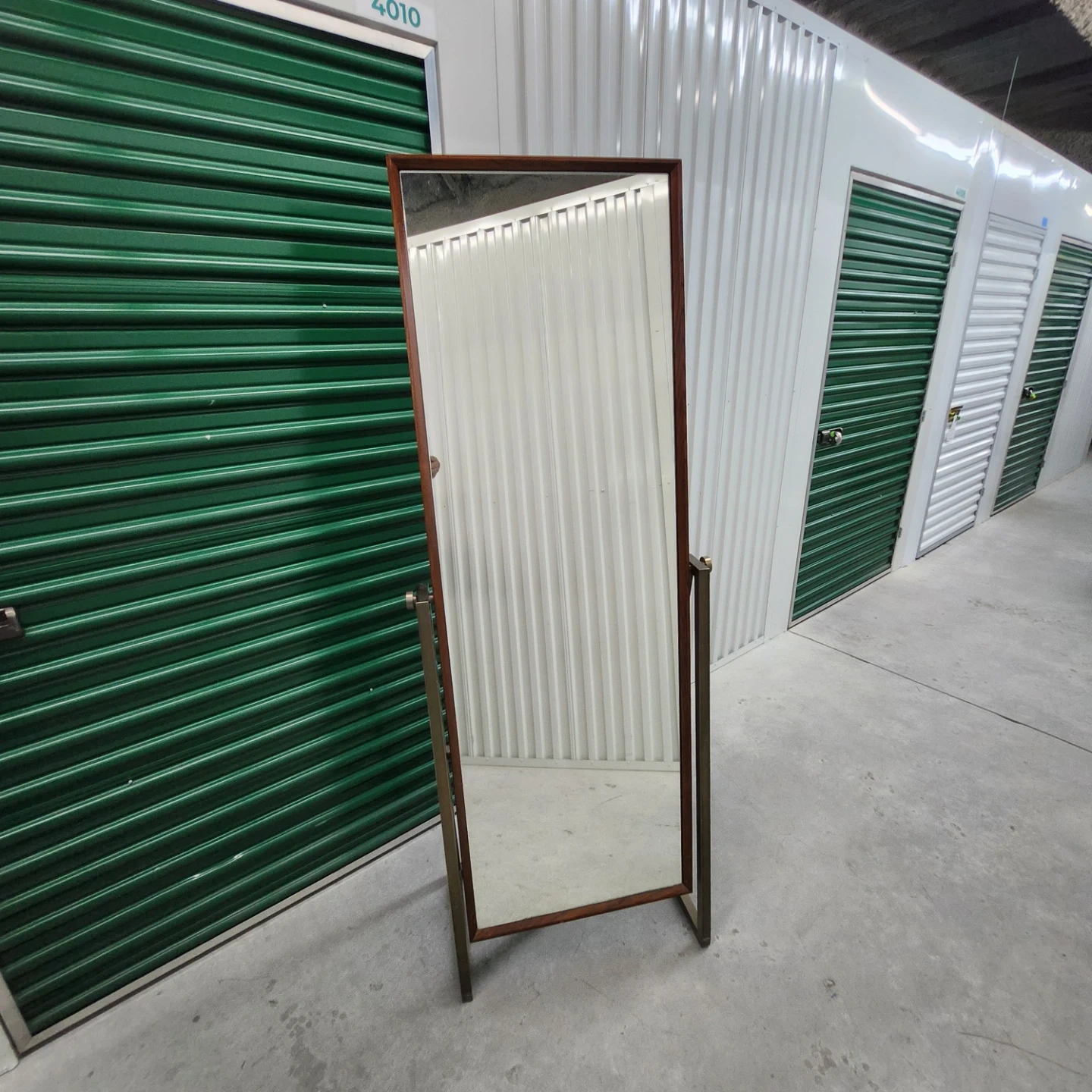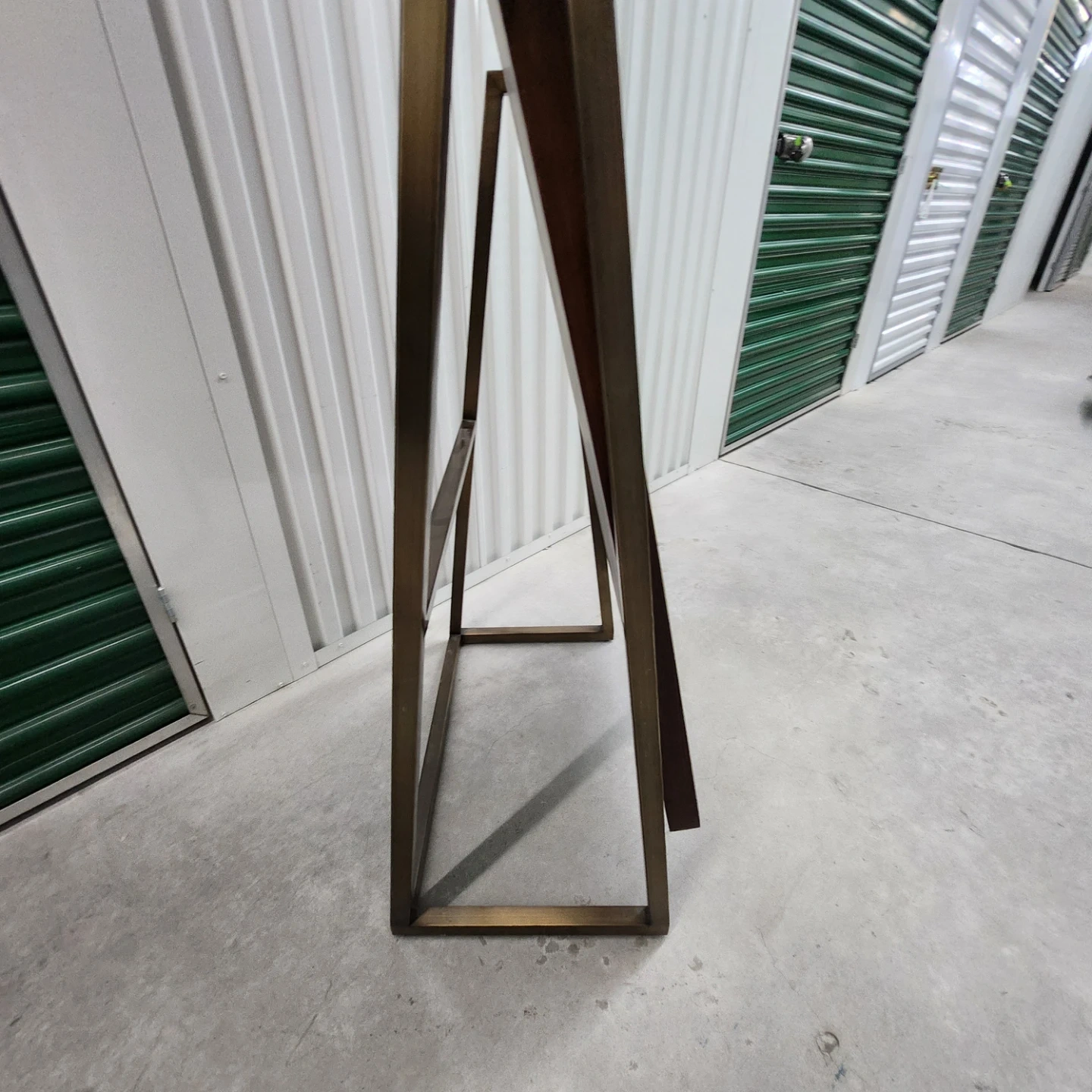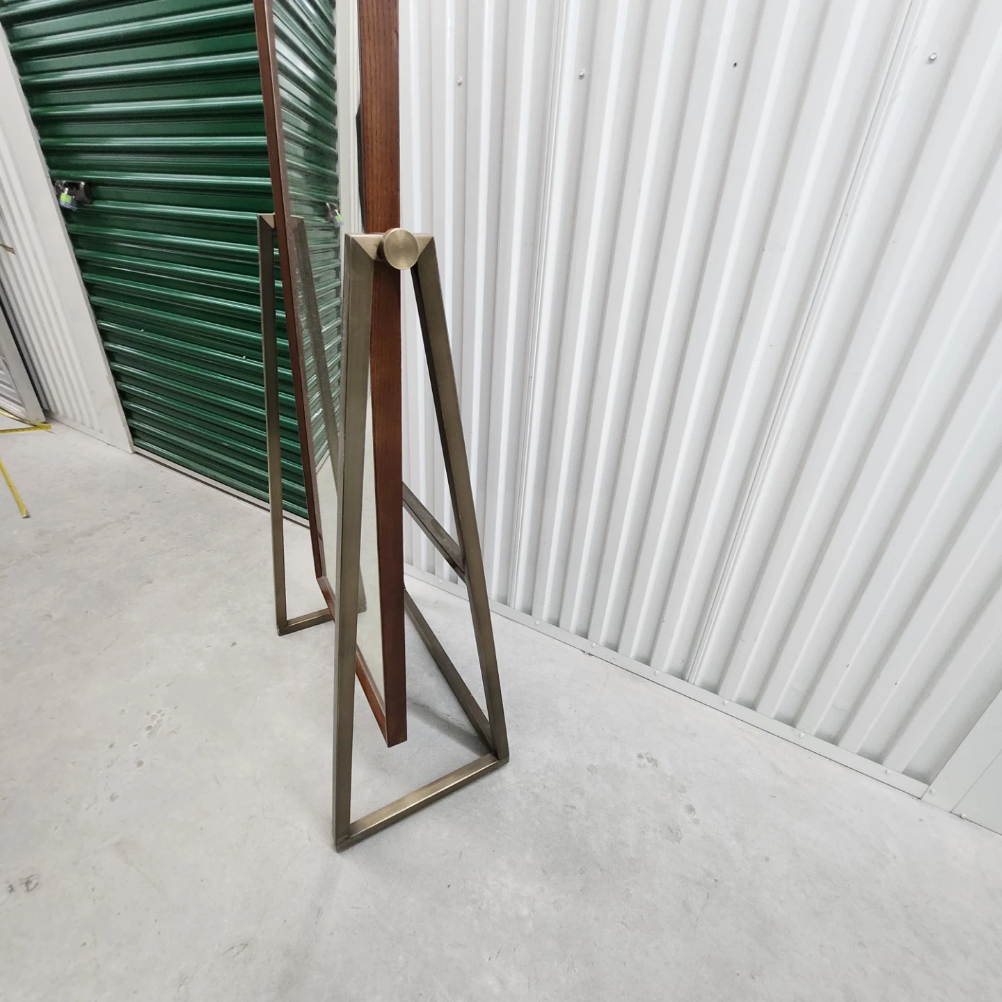 This is a freestanding floor mirror with a wood frame and metal base. It's a stylish accent piece for any room. Adjust mirror position with side knobs.