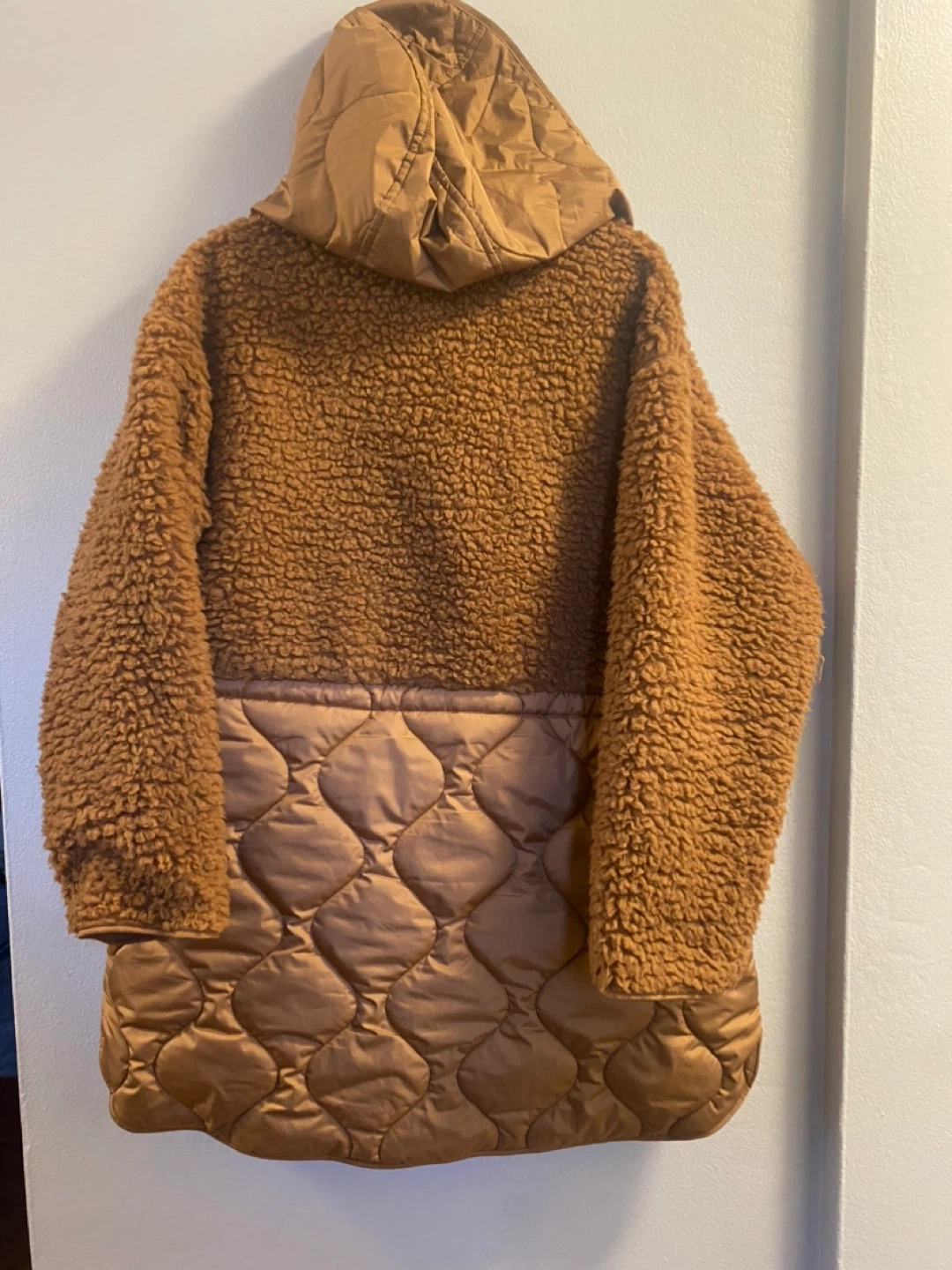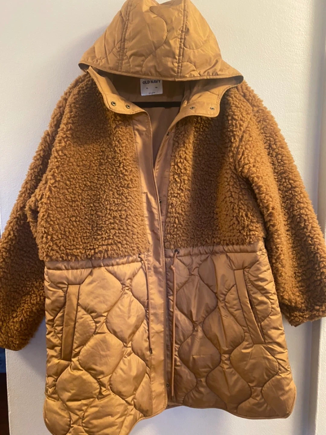 Cozy Old Navy jacket with a teddy fleece upper and a quilted lower. It has a hood and a drawstring waist for a comfortable fit. Great for staying warm on chilly days!