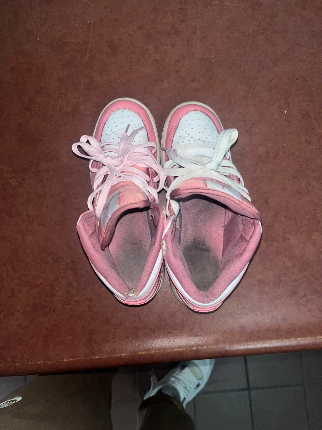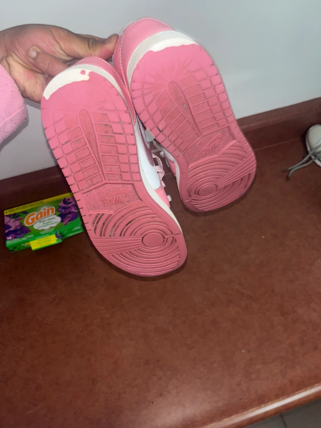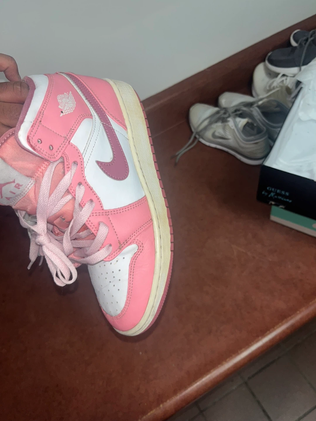 These Nike Air Jordan 1 Mid shoes are a toddler size 7Y. They come in a pink and white colourway. These are a classic sneaker style!