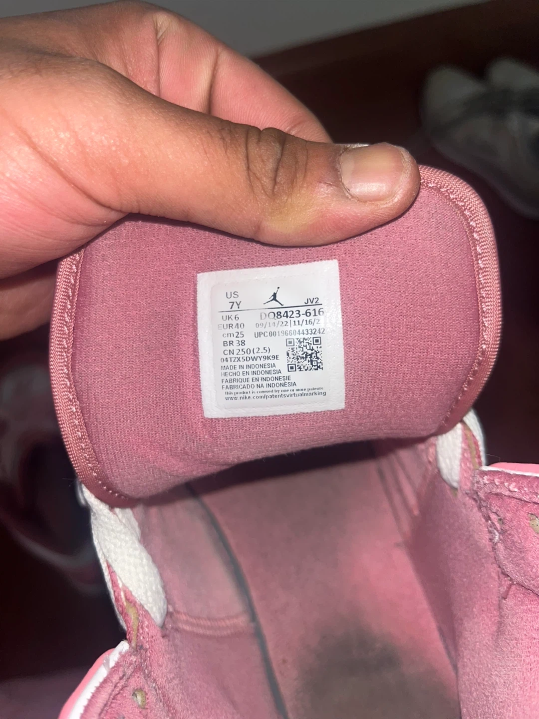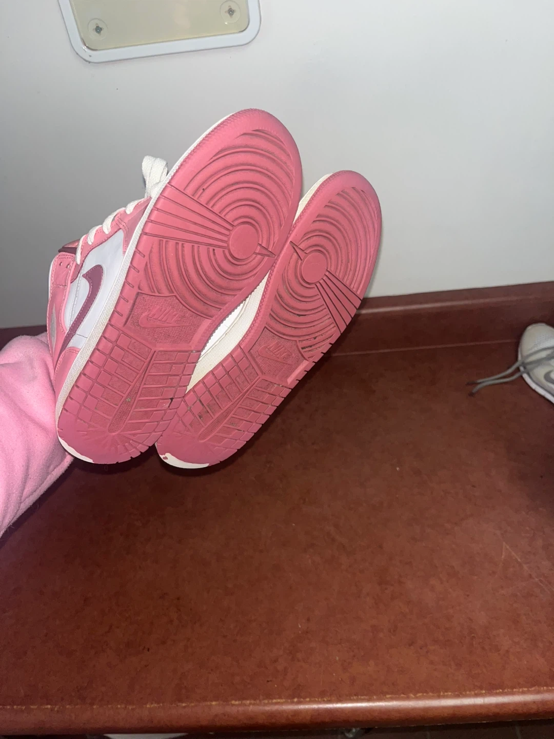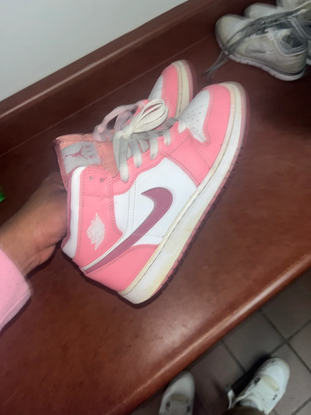 These Nike Air Jordan 1 Mid shoes are a toddler size 7Y. They come in a pink and white colourway. These are a classic sneaker style!
