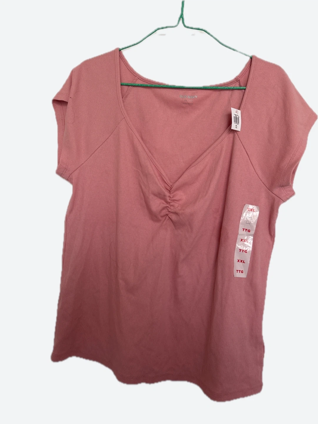 This is an Old Navy pink ribbed t-shirt with a V-neck and ruched detail. It's a size XXL. It's made of a stretchy ribbed fabric.