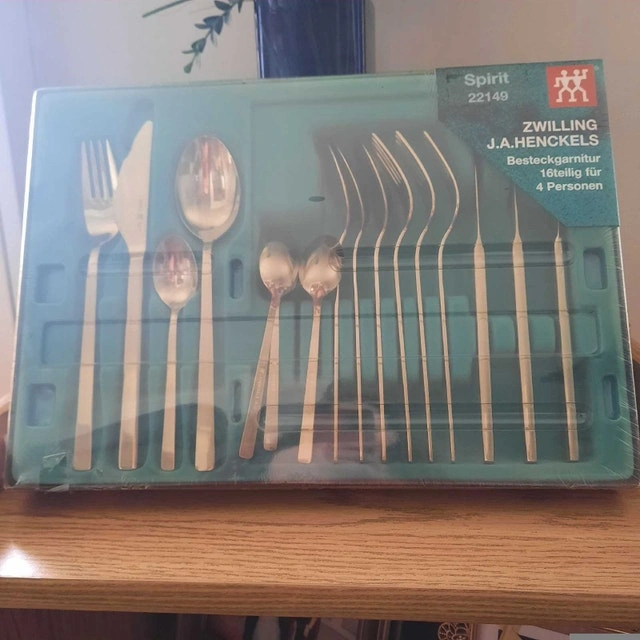 3 boxes of Fiona Jessica Spirit flatware, 16-piece sets that serve 4 people. Never opened. Originally paid $99 each, selling for $50 each.