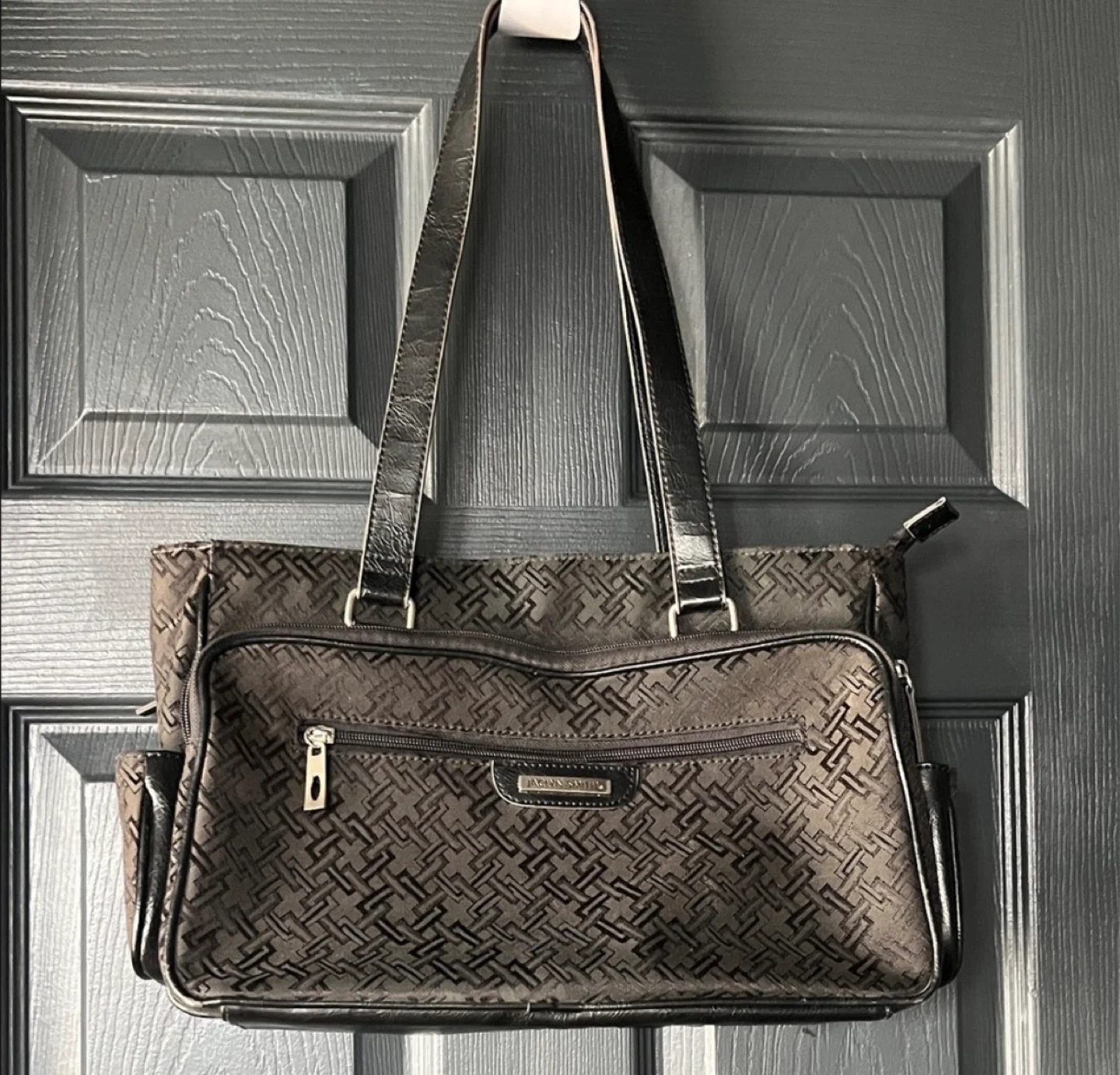 This Jaclyn Smith tote bag is a stylish and practical accessory. It features a classic pattern and multiple zippered compartments for organization. Its durable construction makes it a great everyday bag.