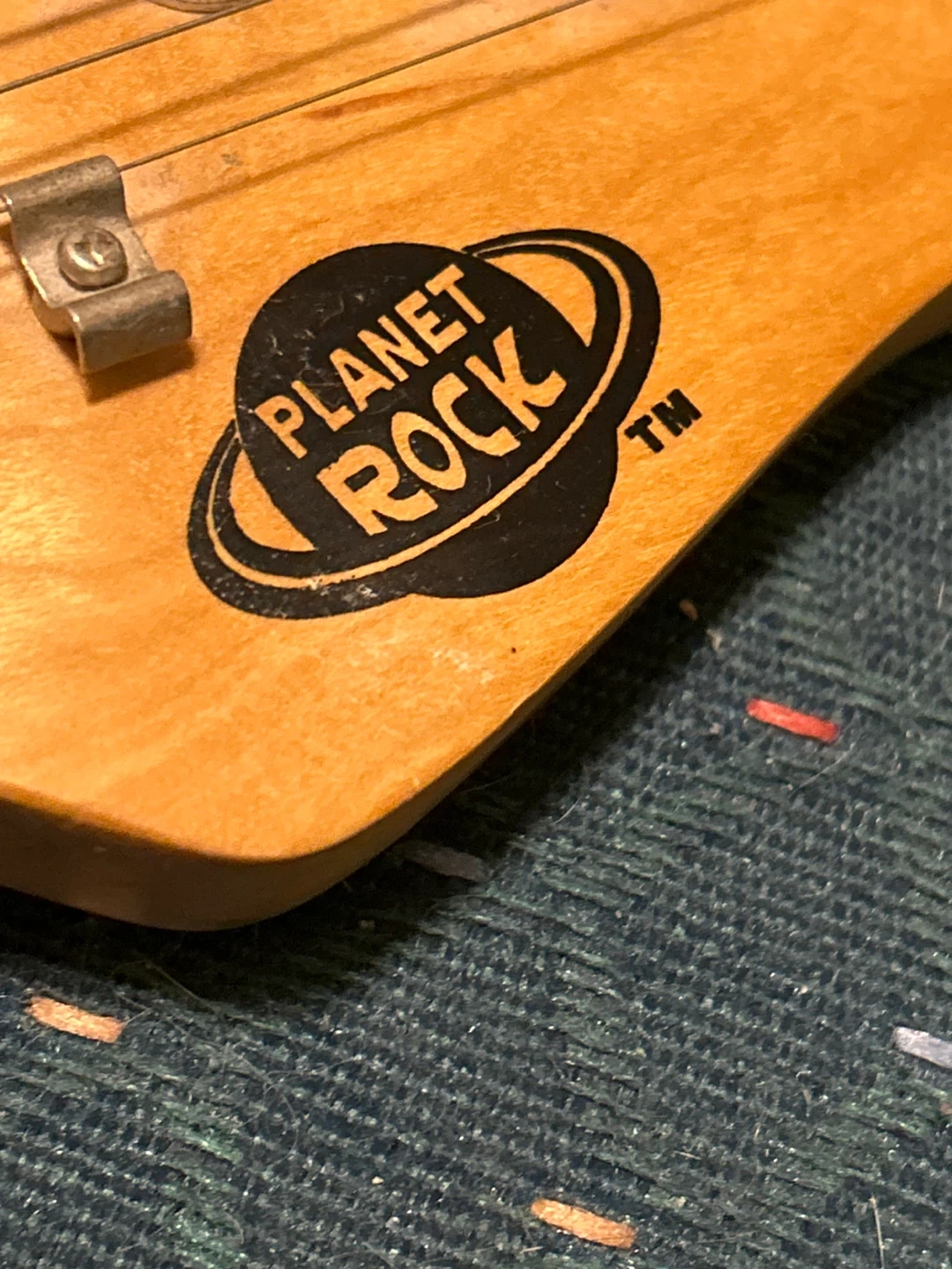 This is a green Planet Rock electric guitar. It has a standard pickup configuration and control knobs. This guitar is great for learning or casual playing.