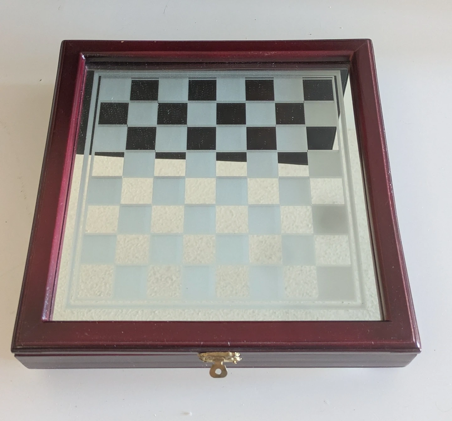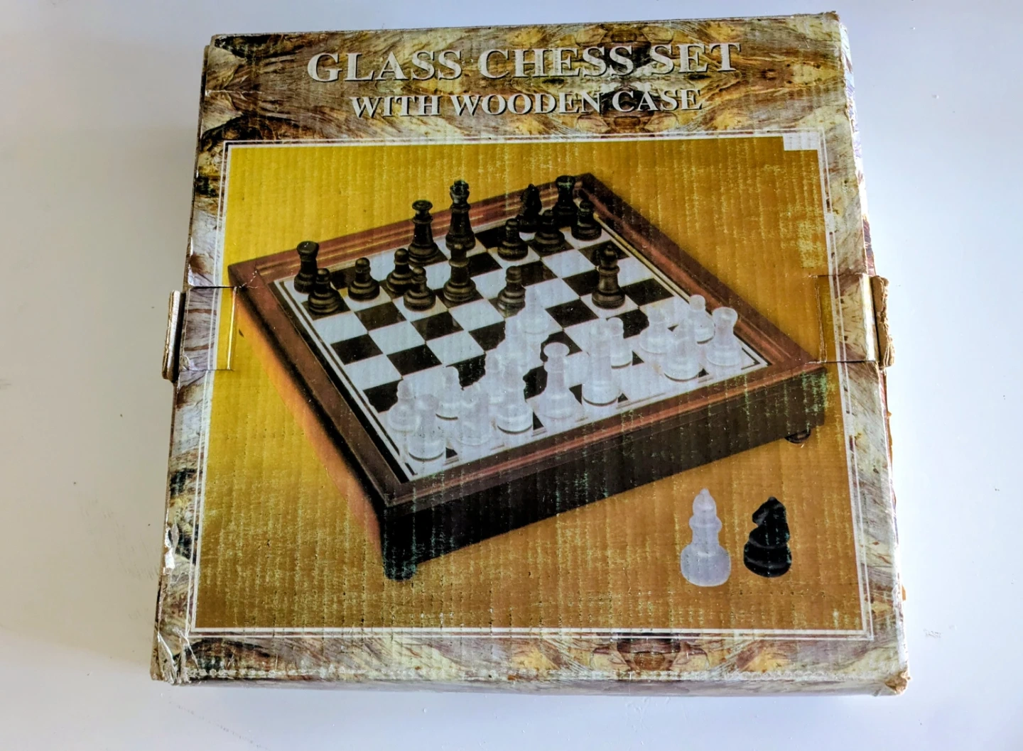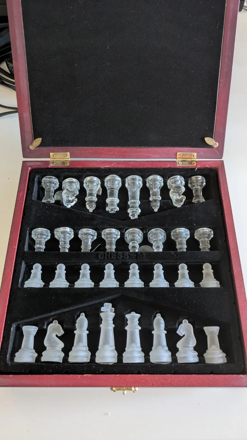 This is a glass chess set with a wooden case. It includes a glass board and glass chess pieces. The case has a velvet lining to hold the pieces securely.