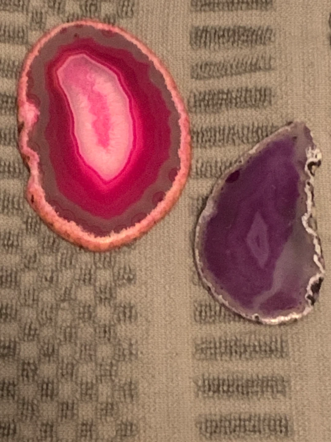 Two beautiful agate slices, one with vibrant pink and white banding and the other in a rich purple hue. These natural stone pieces showcase unique patterns and colours. They're perfect for crafts or decorative accents!