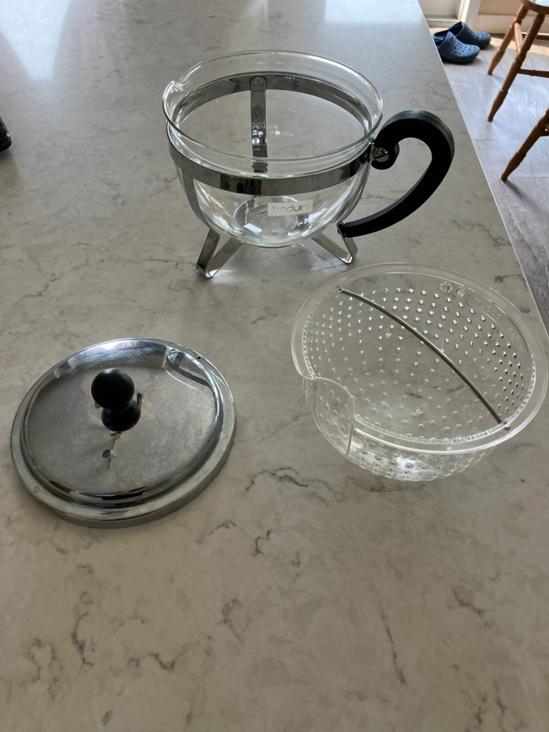 Bodum Tea Press. It's in great condition and ready for a new home! This tea press is perfect for brewing loose leaf tea and comes with all its components. Enjoy a fresh cup of tea with ease!